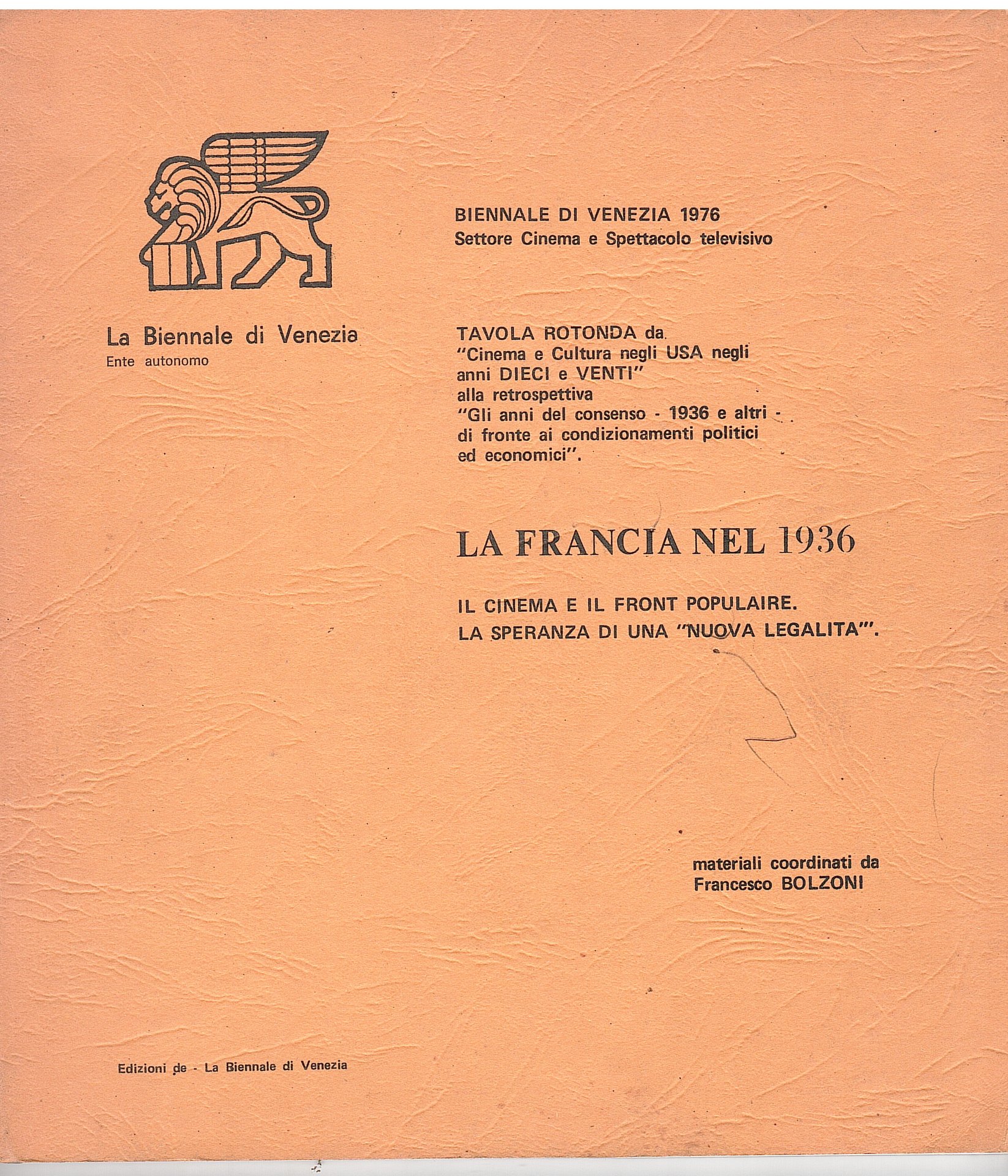 22X24, Venezia, Edizioni della Biennale di Venezia, 1976, catalogo della tavola rotona da "cinema e cultura negli USA negli anni DIECI E VENTI alla retrospettiva Gli anni del consenso-1936 e altri di fronte ai condizionamenti politici ed economici. Materiali coordinati da Francesco Bolzoni. 74 pag. colophon riporta bozza di stampa. in anteprima timbro di appartenenza e pagina lenta, per il resto buone condizioni generali