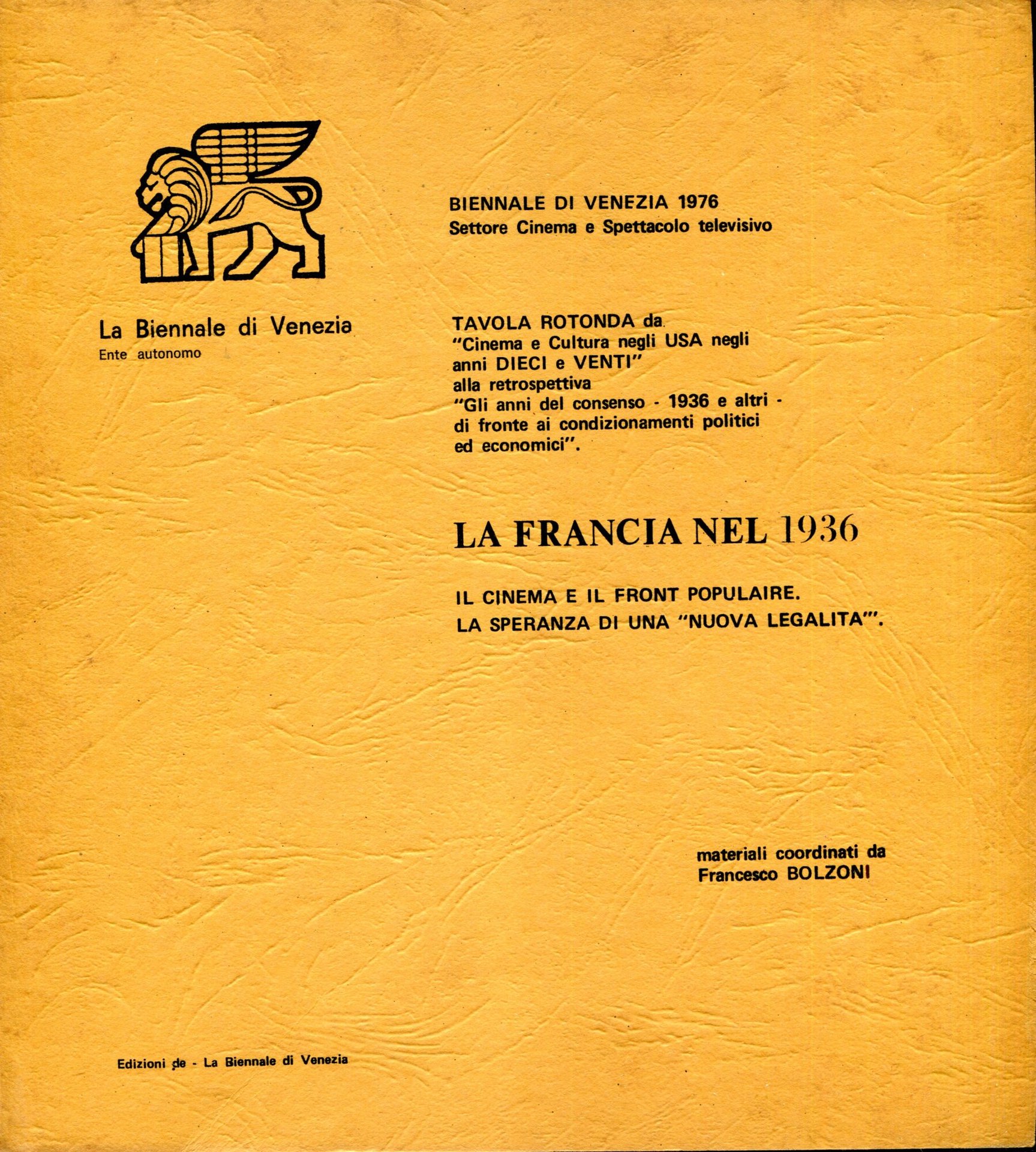 Catalogo della tavola rotona da "cinema e cultura negli USA negli anni 10 e 20" alla retrospettiva "Gli anni del consenso-1936 e altri di fronte ai condizionamenti politici ed economici". Materiali coordinati da Francesco Bolzoni. Brossura 74 pag. colophon riporta bozza di stampa Molto buono (Very Good) .