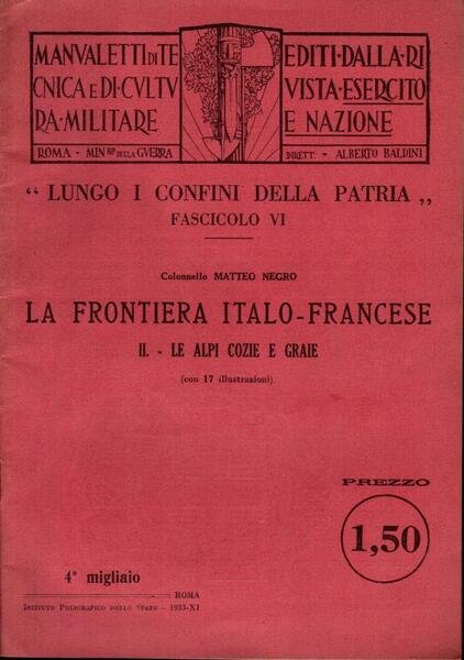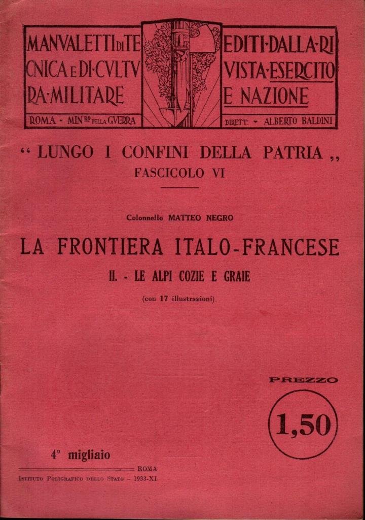 "La frontiera italo-francese. Le Alpi Cozie e Graie", edizione 1933, pp. 40, formato 17 x 24.