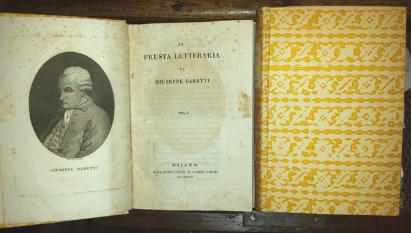 In-8 (21,5 cm) 2 voll. XVIII 479 (1); 489. Pieno cartoncino decorato. Fa parte delle opere. Giuseppe Marco Antonio Baretti, noto comunemente come Giuseppe Baretti (Torino, 24 aprile 1719 – Londra, 5 maggio 1789), è stato un critico letterario, traduttore, poeta, scrittore, drammaturgo e linguista italiano. Spirito irriverente e ribelle, Baretti fa della sua Frusta letteraria un'efficace ed estrosa arma polemica contro la stucchevole poesia bucolica, l'erudizione accademica, il bigottismo religioso. Nonostante questa sua veemente vena polemica anticonformista, non riesce a entrare in sintonia con lo spirito dei nuovi tempi, che sono i tempi dell'Illuminismo. È stato non a caso definito un «ribelle conservatore» (Bartolo Anglani, Il mestiere della metafora: Giuseppe Baretti intellettuale e scrittore, Studi e documenti. Centro nazionale di studi alfieriani, 11, Mucchi, Modena, 1997.)