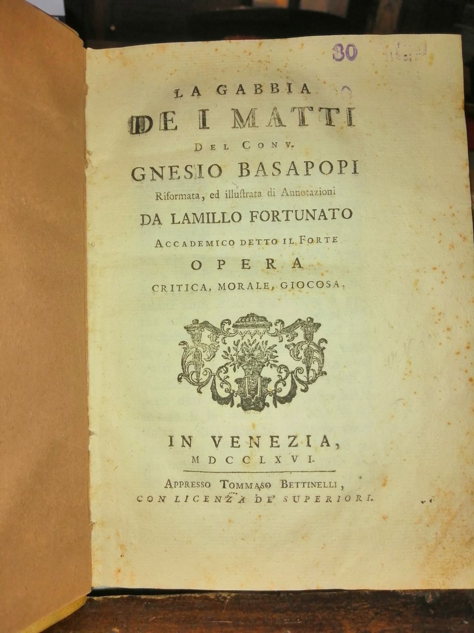 La gabbia de i matti del conv. Gnesio Basapopi riformata, ed illustrata di annotazioni da Lamillo Fortunato accademico detto il Forte opera critica, morale, giocosa
