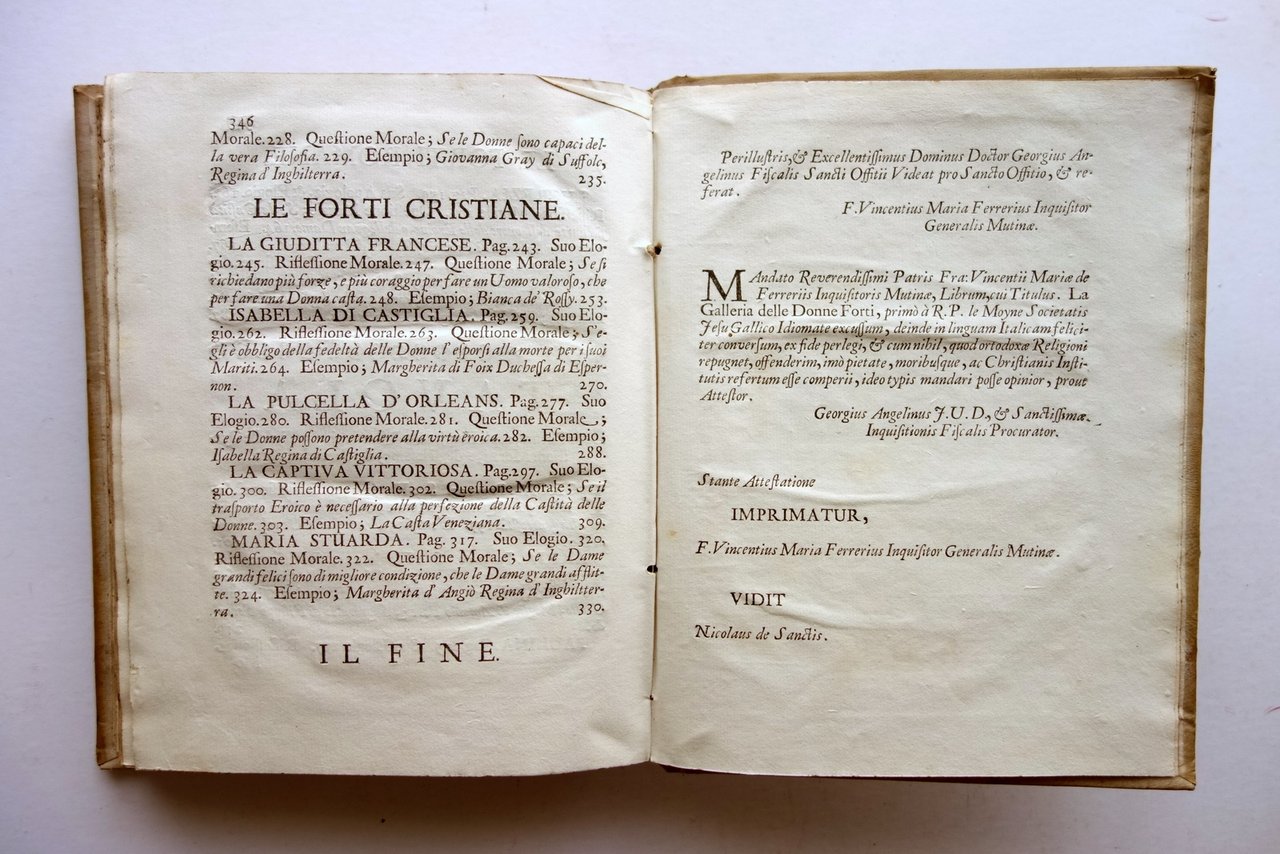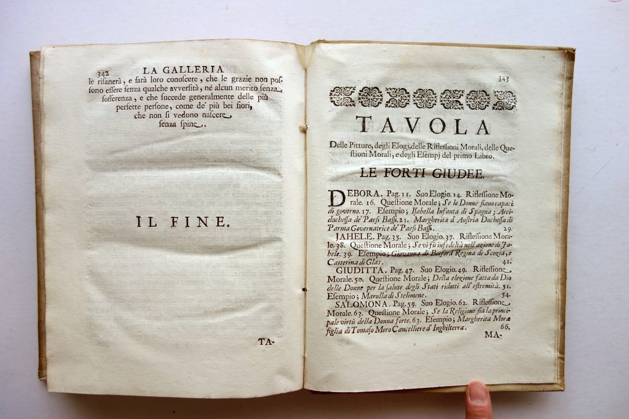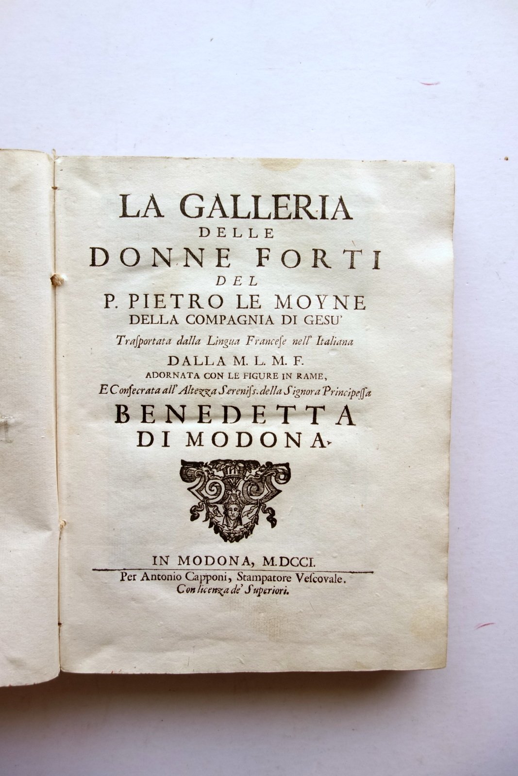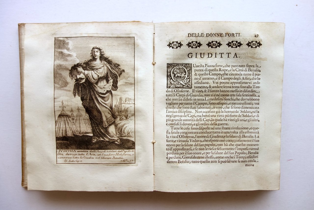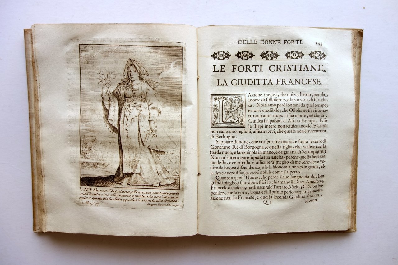Settecentina, † La galleria delle donne forti del P. Pietro le Moyne della Compagnia di Ges˘ trasportata dalla lingua francese nell'italiana dalla M. L. M. F. adornata con le figure in rame, e consecrata all'Altezza Serenissima della Signora Principessa Benedetta di Modena Per Antonio Capponi, Modena 1701; cm 24,5x18,5; pp. XX-346-[2], con alcuni capilettera e fregi inc. in b/n e 20 belle tavv. incise in b/n fuori t. da Natale dal Re; bellissima antiporta figurata, inserita dal legatore dopo il frontespizio (vedi foto); legatura d'epoca in piena pergamena con titolo annotato a mano al dorso, piatti colorati a spruzzo.† † Condizioni di conservazione Buone condizioni con tracce d'uso e leggeri segni del tempo; coperta con alcuni minimi / minuscoli aloni e poche pressochÈ trascurabili mancanze al rivestimento in pergamena. Interni buoni, complessivamente freschi, con alcune minime bruniture; cerniera interna anteriore fessurata con conseguente parziale distacco del dorso dal corpo del testo, esemplare compatto (vedi foto); risguardo anteriore con tracce di pieghe e un restauro cartaceo all'angolo superiore destro. † Esemplare molto raro, completo dell'antiporta figurata (inserita dal legatore dopo il frontespizio) e delle 20 belle tavole incise in bianco e nero da Natale dal Re. Buon esemplare, saldo, complessivamente fresco. † SETT67.L23765 N