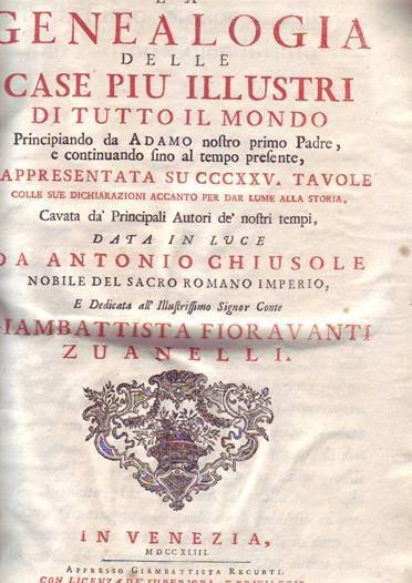 LA GENEALOGIA DELLE CASE PIU' ILLUSTRI DI TUTTO IL MONDO Principiando da Adamo Nostro Primo Padre, e Continuando fio al Tempo Presente, Rappresentata su CCCXXV Tavole colle sue Dichiarazioni accanto per dar Lume alla Storia, Cavata da' Principali Autori .