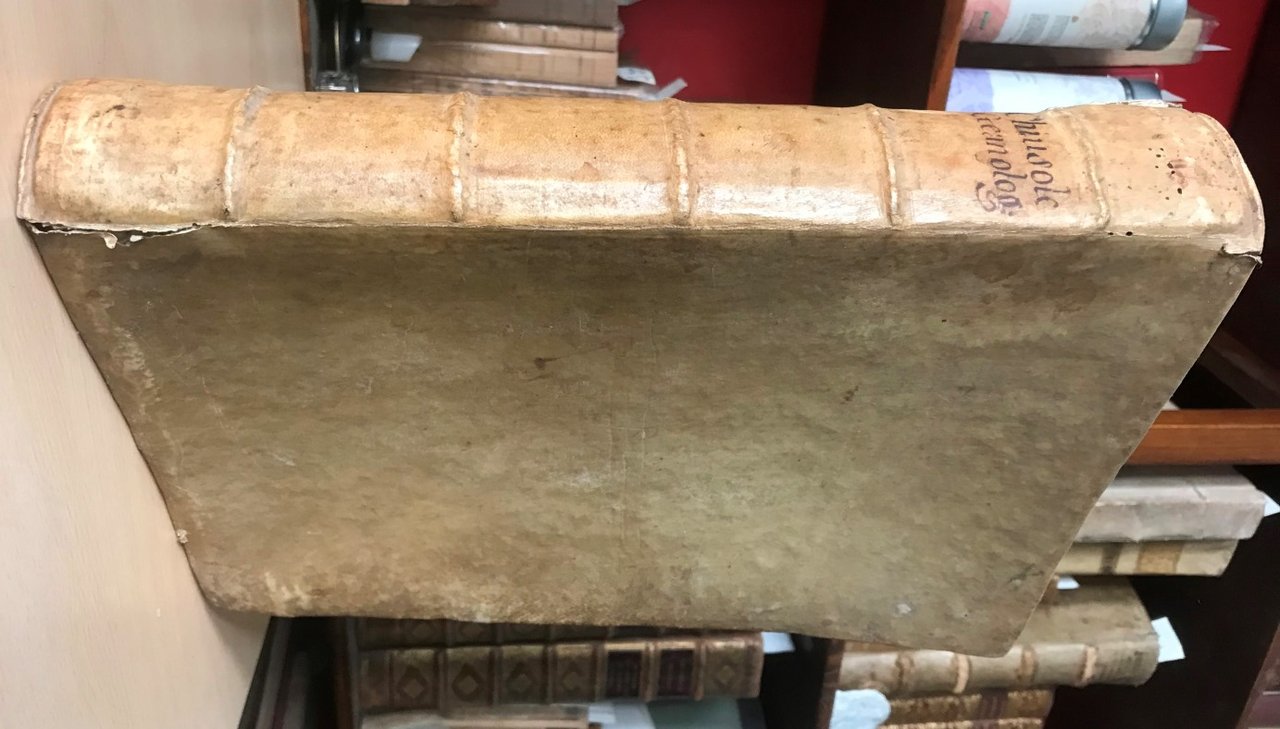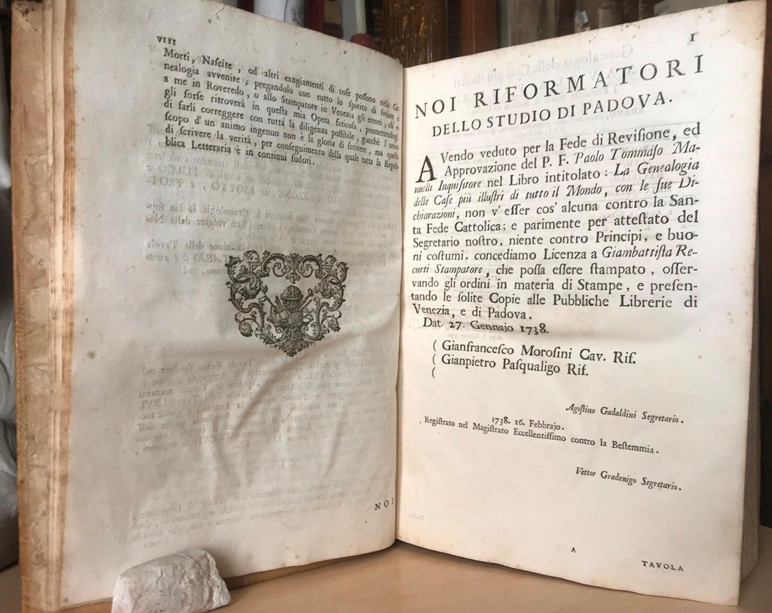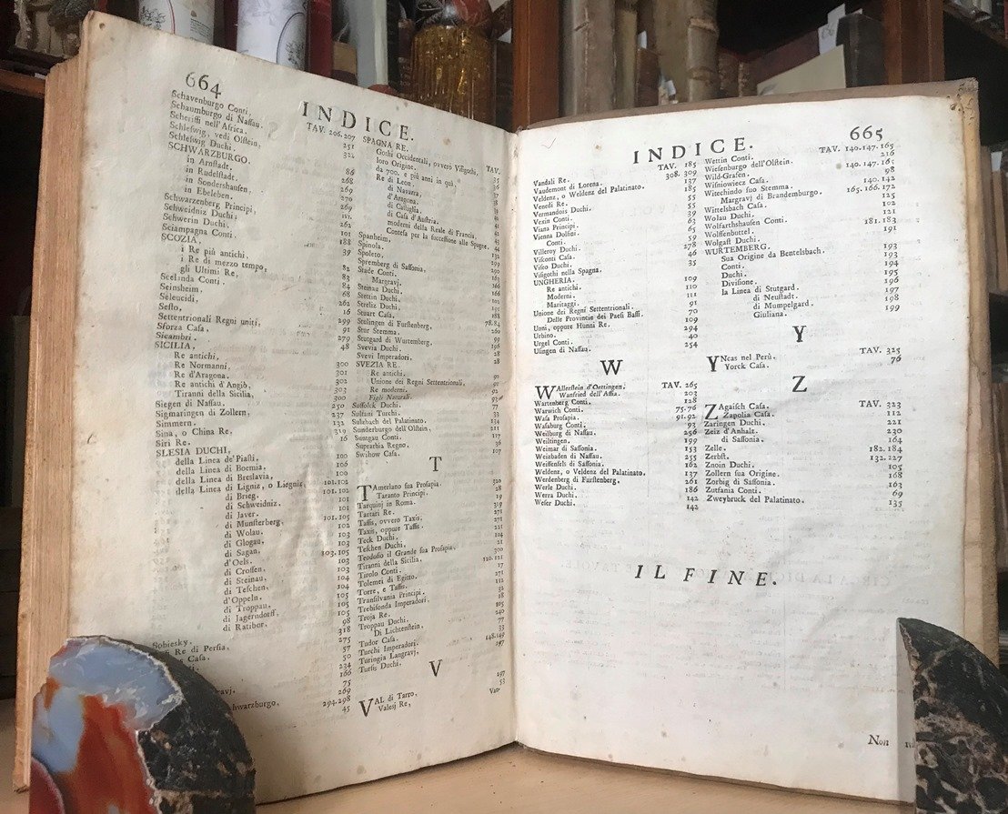Volume in folio, legatura coeva in piena pergamena, titolo manoscritto al dorso a cinque nervi, sguardie, occhiello, frontespizio in rosso e nero con grande marca xilografica, carta dedicatoria al Conte Giambattista Fioravanti Zuanelli, prefazione ed approvazione, (8), VIII, 665 (i.e. 655, numerazione errata), (1) pp. Interessante e notevole opera in edizione originale, di questo autore trentino, nobile del Sacro Romano Impero, viaggiatore geografo e matematico. Chiara, essenziale e facilmente consultabile, ogni tavola genealogica riporta a fronte una esauriente spiegazione studiata sotto l'aspetto storico politico oltre che della consanguineit. Carta greve e frusciante, chiara e priva di mende o fioriture, bel carattere corsivo romanico grande, alcune magnifiche e grandi capilettera e testatine ornate in xilografia, minime mende alle estremit delle cerniere. Opera completa ed originale. Rara, di grande interesse ed in pi che bello stato.