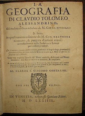 La Geografia di Claudio Tolomeo alessandrino già tradotta di greco in italiano da M. Gero. Ruscelli & hora in questa nuova editione da M. Gio. Malombra ricorretta.