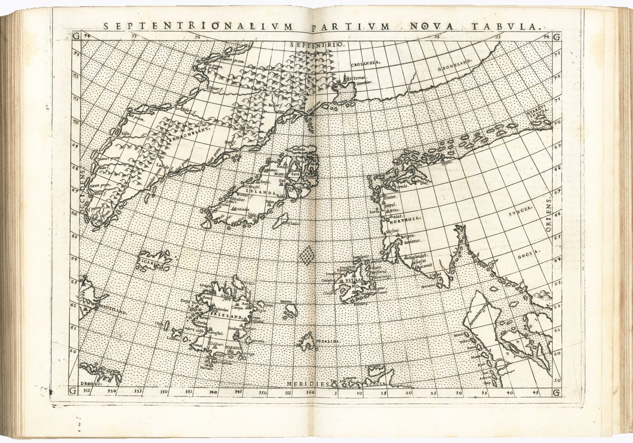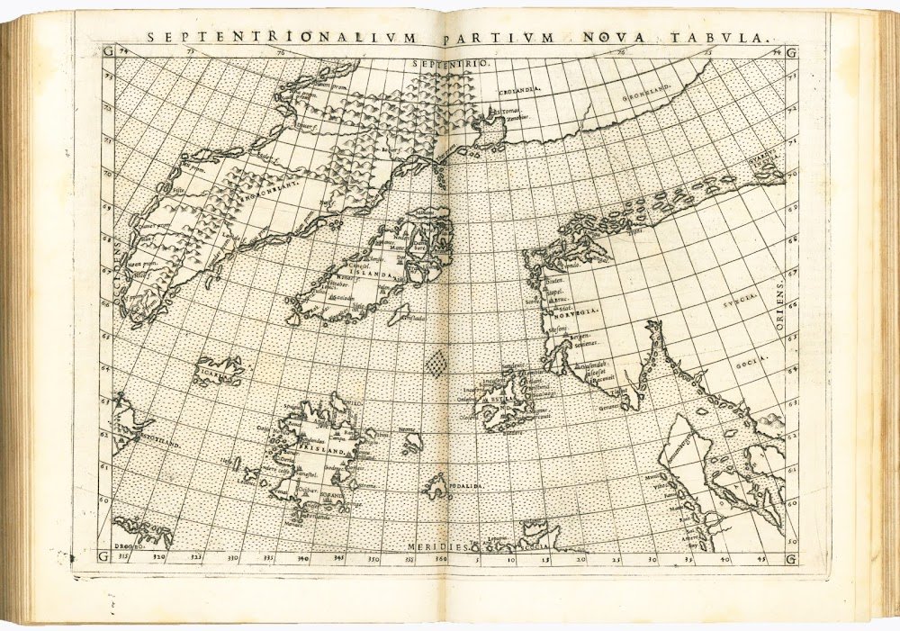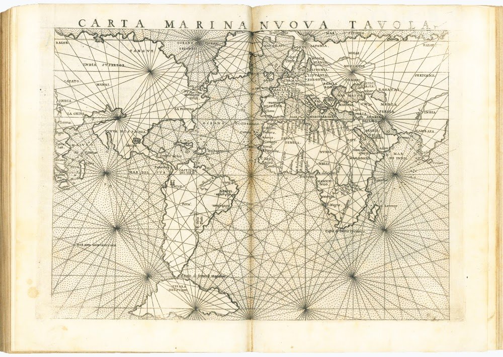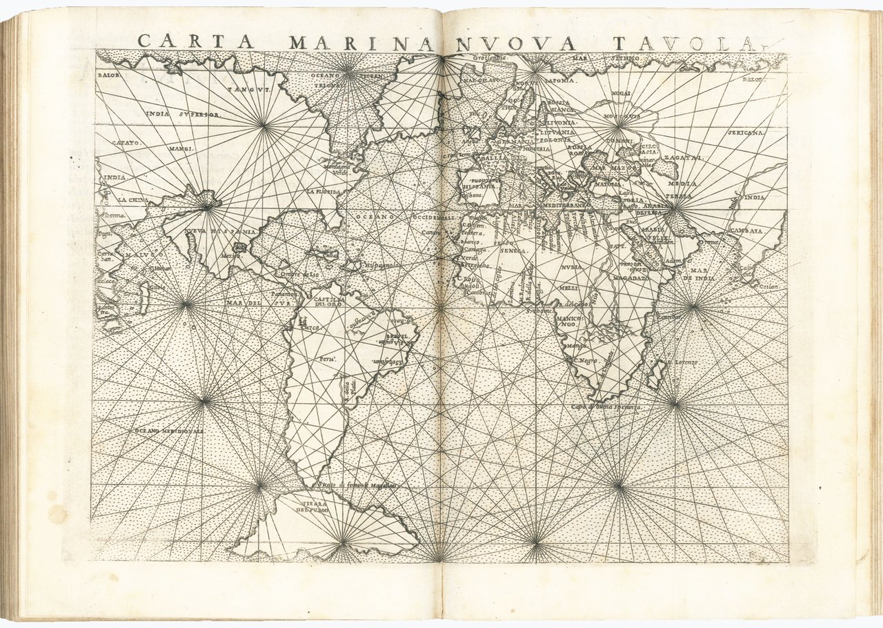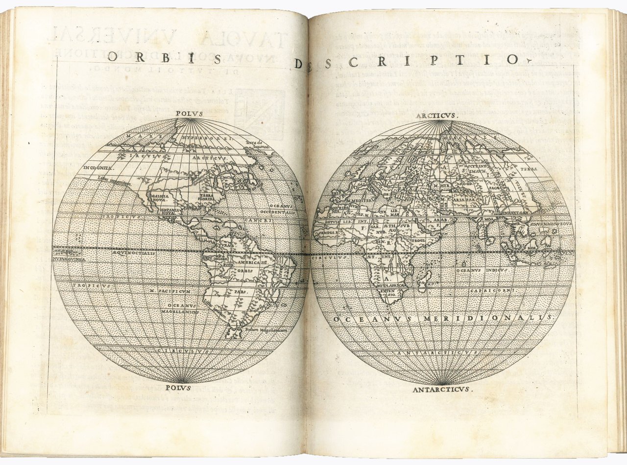 Ruscelli was responsible for the Italian translation of the text and for the maps, which he drew reproducing on a larger scale those published by Gastaldi in his 8vo edition of Ptolemy's Geography appeared in 1548. The most important innovation introduced by Ruscelli is the division of the modern globe into two circular hemispheres depicting the New World and the Old World; a feature previously used only by François de Malines in 1528 and later become popular with the famous Mercator globe of 1587. Particularly innovative is also the map of the Arctic regions, in which Ruscelli correctly separates Greenland from Norway, usually depicted as forming a single land.