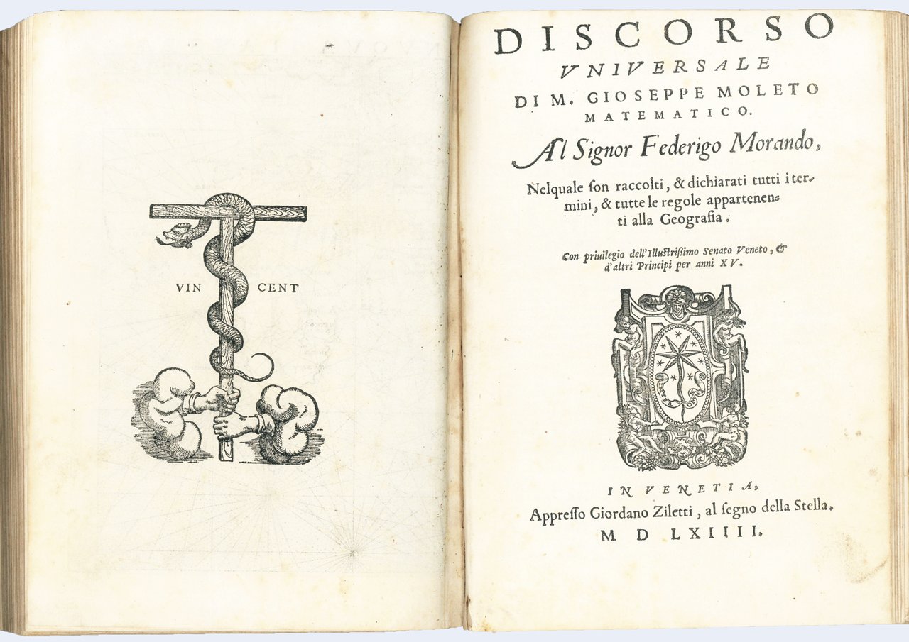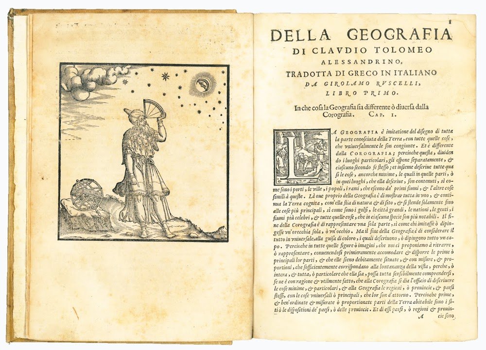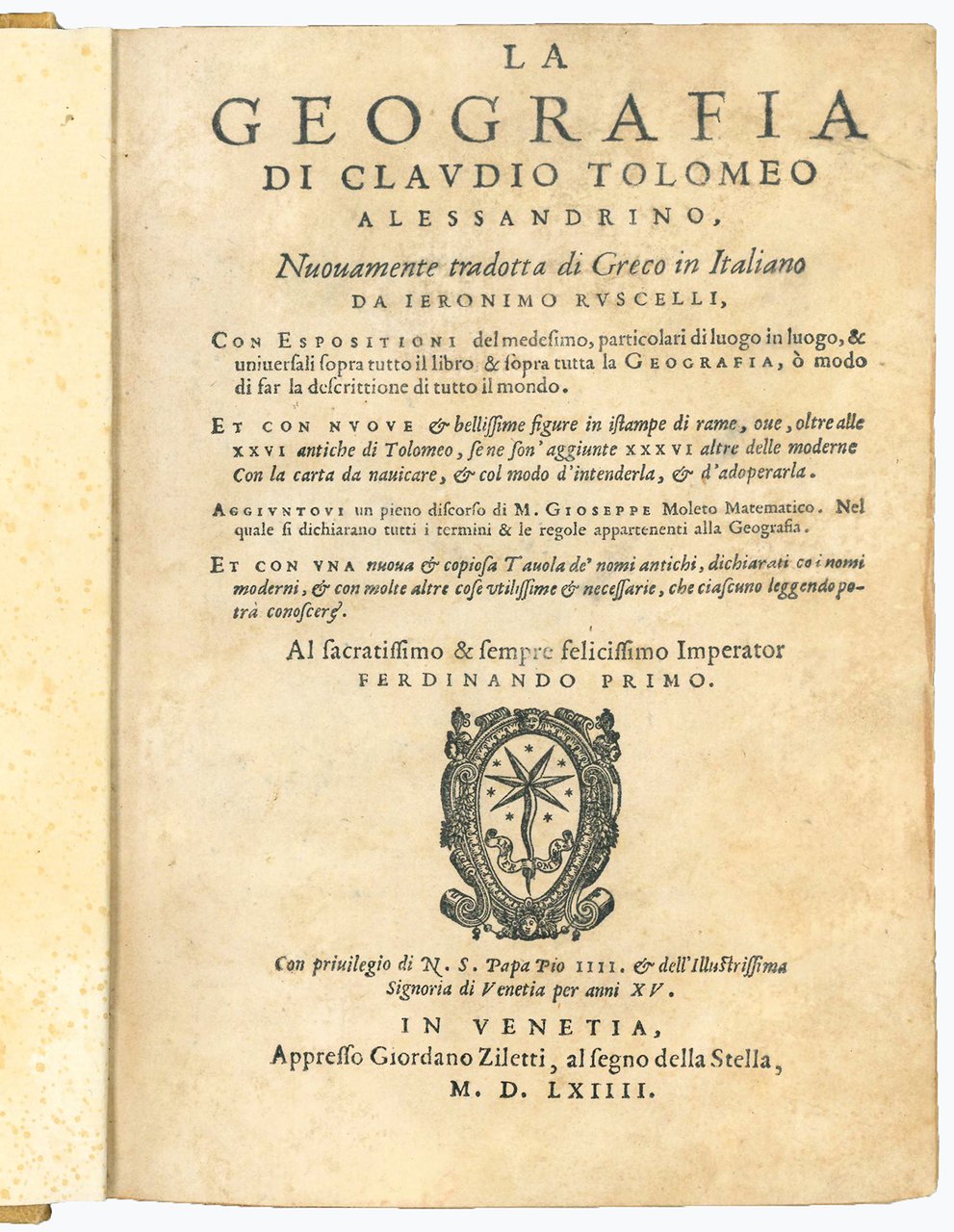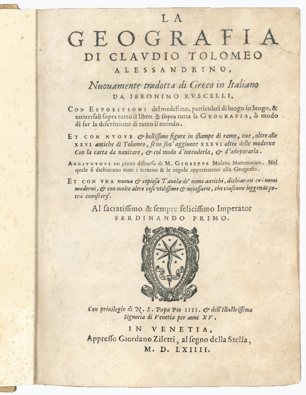 La geografia di Claudio Tolomeo alessandrino, nuovamente tradotta di greco in italiano, da Ieronimo Ruscelli, con Espositioni del medesimo, particolari di luogo in luogo, [...] Et con nuove & bellissime figure in istampe di rame, ove, oltre alle XXVI antiche di Tolomeo, se ne son'aggiunte XXXVI altre delle moderne. Con la carta da navicare, & col modo d'intenderla, & d'adoperarla. Aggiuntovi un pieno discorso di M. Gioseppe Moleto matematico. Nel quale si dichiarano tutti i termini & le regole appartenenti alla geografia. Et con vna nuova & copiosa Tavola
