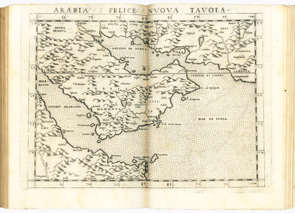 Second Ruscelli edition of Ptolemy's Geography, a reprint of the first issued by Vincenzo Valgrisi in 1561. A third edition, revised and corrected by Giovanni Malombra and with the addition of a map (Territoria di Roma), was printed by Ziletti in 1574.