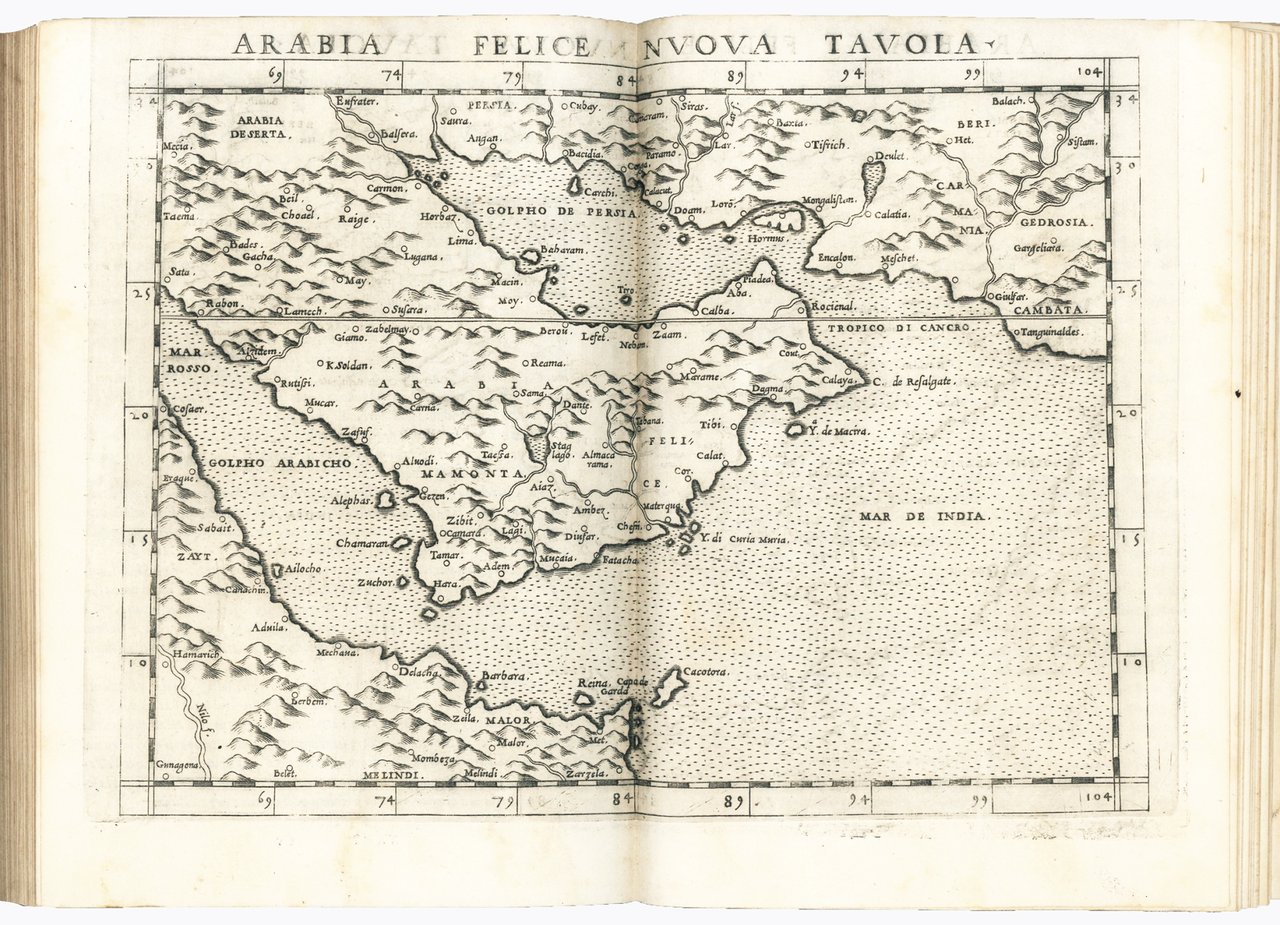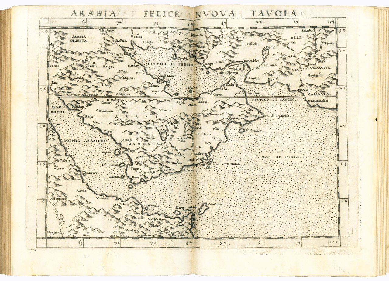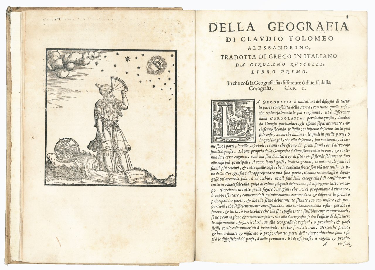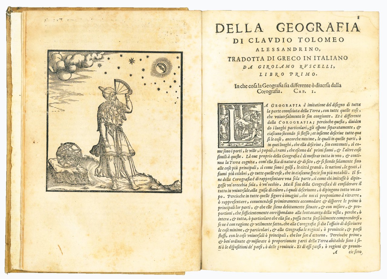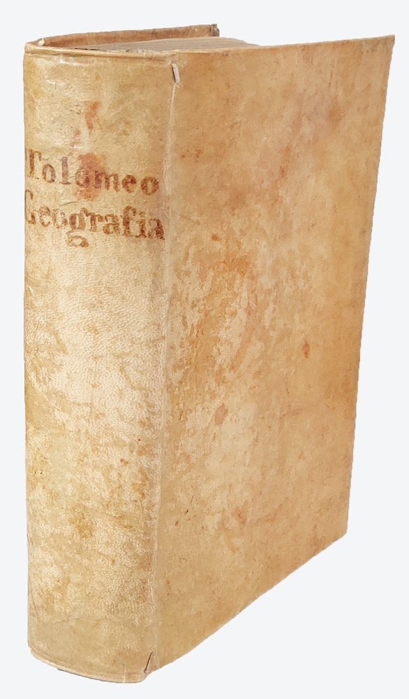Three parts (each with a separate title page) in one volume, 4to (mm 212x152). Geografia: [8], 358, [2] pp.; Espositioni et introduttioni universali di Girolamo Ruscelli sopra tutta la Geografia di Tolomeo: [28] leaves, [4: Tavola universale, con la descrittione di tutto il mondo] pp., 27 and XXXVI engraved numbered double plates; Discorso universale di M. Giuseppe Moleto matematico: 47, [49] pp. Signatures: *4 A-YY4; α-η4 +2 1-272 (2A-2Z2 A1-D42) I-XXXVI2 (3A-Nn2); 4A-4F4 5A-5F4. The edition contains several woodcut diagrams and illustrations in the text (including two portraits of Ptolemy), and overall 64 engraved double-page maps, of which 27 are Ptolemaic and 37 are new. Ziletti's device on title pages, Valgrisi's device after plate XXXVI (l. Nn4v). Later vellum with inked title on spine (endleaves renewed). Tear anciently repaired to l. η4 with no loss, slightly uniformly browned, some light occasional marginal foxing and staining, short margins, but overall a good copy.