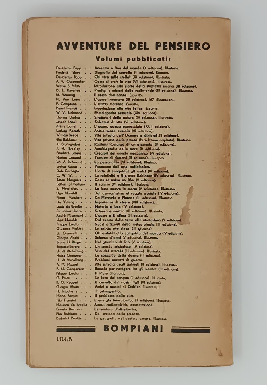 PRIMA EDIZIONE. Brunitura generale data dal fattore tempo. Prima pagina bianca mancante. Visibili segni d'usura, ma perfettamente fruibile.