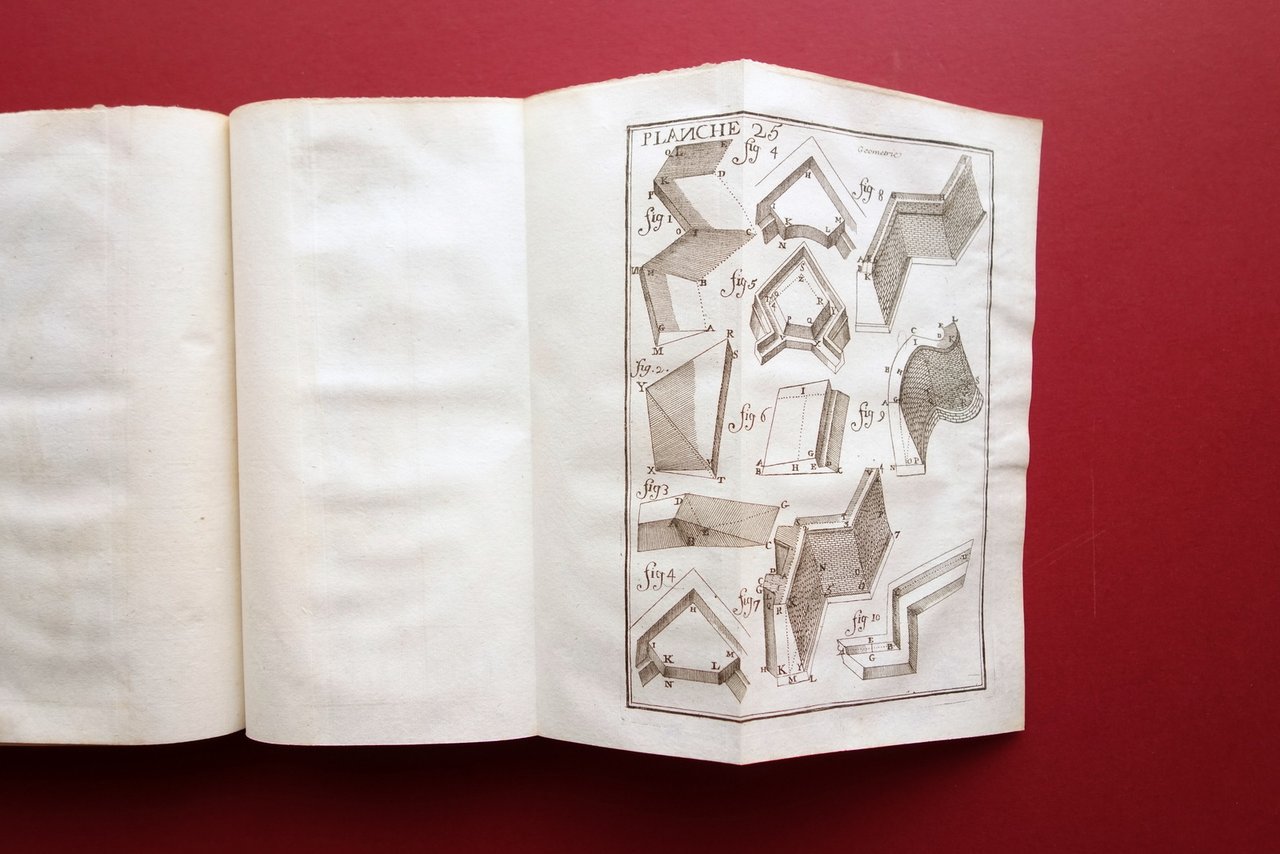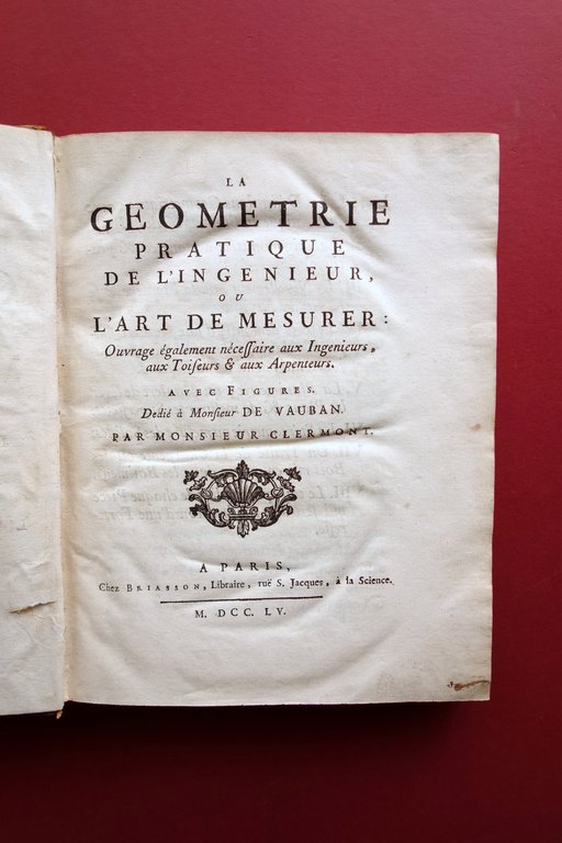 Settecentina, La Geometrie Pratique de l'Ingenieur ou l'art de mesurer: ouvrage egalement nécessaire aux Ingenieurs, aux Toiseurs et aux Arpenteurs avec figures par Monsieur Clermont *** L'Arithmetique Militaire ou l'Arithmetique Pratique de l'Ingenieur et de l'Officier [.] par Monsieur Clermont, Commissaire d'Artillerie Ches Briasson, Paris 1755 (entrambi); cm 22x17; pp. XXIV-260, con 23 belle tavv. inc. in b/n fuori t., ripiegate più volte (Geometrie pratique); da pagina 267 a 418, esemplare autonomo con numerazione progressiva (Arithmetique Militaire); legatura coeva in piena pelle con titolo e bei fregi impressi in oro al dorso con nervature, tagli rossi. Al contropiatto anteriore applicato ex libris del precedente proprietario. Testo in francese. Due opere del medesimo autore, rilegate in un unico volume. Condizioni di conservazione Volume in buone condizioni con tracce d'uso e leggeri segni del tempo; coperta con alcune piccole leggere abrasioni e poche piccole mancanze al rivestimento in pelle, leggere fessurazioni alle cerniere in corrispondenza delle cuffie. Margine inferiore del piatto anteriore con tracce di nastro adesivo precedentemente applicato. Interni buoni con lievi / leggeri accenni di ingiallimento del tempo; qualche minima lieve brunitura. Due opere del Clermont, rilegate in un unico volume. La Geometrie Pratique" presenta 27 belle tavole incise in bianco e nero, tutte ripiegate. L'opera "Arithmetique Militaire" probabilmente è mancante dell'antiporta. Testo in francese. SETT223.L22051 N "