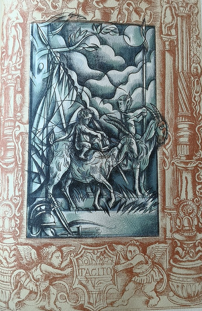 4°; pp. non num. 64 su carta Alcantara filigranata; carattere Dante: Con tre litografie a colori a piena pagina altre ripetute ai margini e a chiusa della versione italiana. Brochure edit. grigia con titolo al dorso, litografia al piatto, taglio in testa rifilato, intonso al piede e al margine esterno; astuccio editoriale. Bella edizione nella traduzione di Marinetti accompagnata dal testo latino tratto da "Cornelii Taciti, Opera minora"; stampata in complessivi 130 esemplari di cui 100, come il presente, ad personam. Firma dell'artista al colophon. Cfr. Parmiggiani "Parole figurate".<BR>(vedi riproduz.)