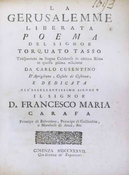 LA GERUSALEMME LIBERATA. - Trasportata in lingua Calabrese in ottava Rima in questa prima edizione da Carlo Cusentino d'Aprigliano, Casale di Cosenza, e dedicata all'Eccell.mo Signor D. Francesco Maria Carafa, Principe di Belvedere, Principe di Gallicchio, e Marchese di Anzi, &c.