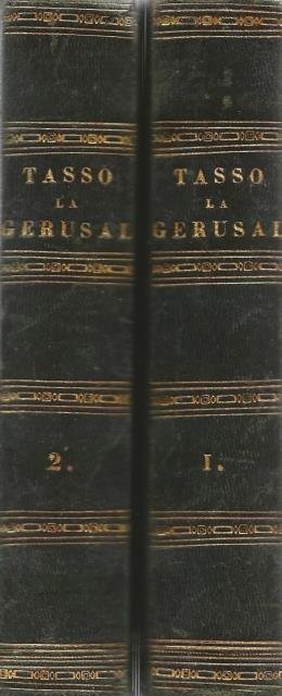 Mantova, Co' Tipi Virgiliani di L. Caranenti, 1828. Due tomi in due volumi in 12esimo, ritrattino del Tasso in antip. pp. CIV, 413; incisione in antip. 508. Legature con dorso in pelle verde, titolo e fregi in oro, piatti in cartonato marmorizz. fra l'azzurro e il marrone, tagli gialli in pointillé arancio. Uno strappo alla velina del secondo volume che protegge l'incisione, ottima conservazione.
