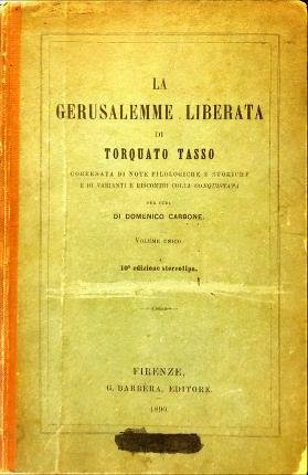 La Gerusalemme liberata. Per cura di Domenico Carbone. Corredata di note filologiche e storiche e di varianti e riscontri colla conquistata per di Domenico Carbone. Volume primo. 10a edizione stereotipa.