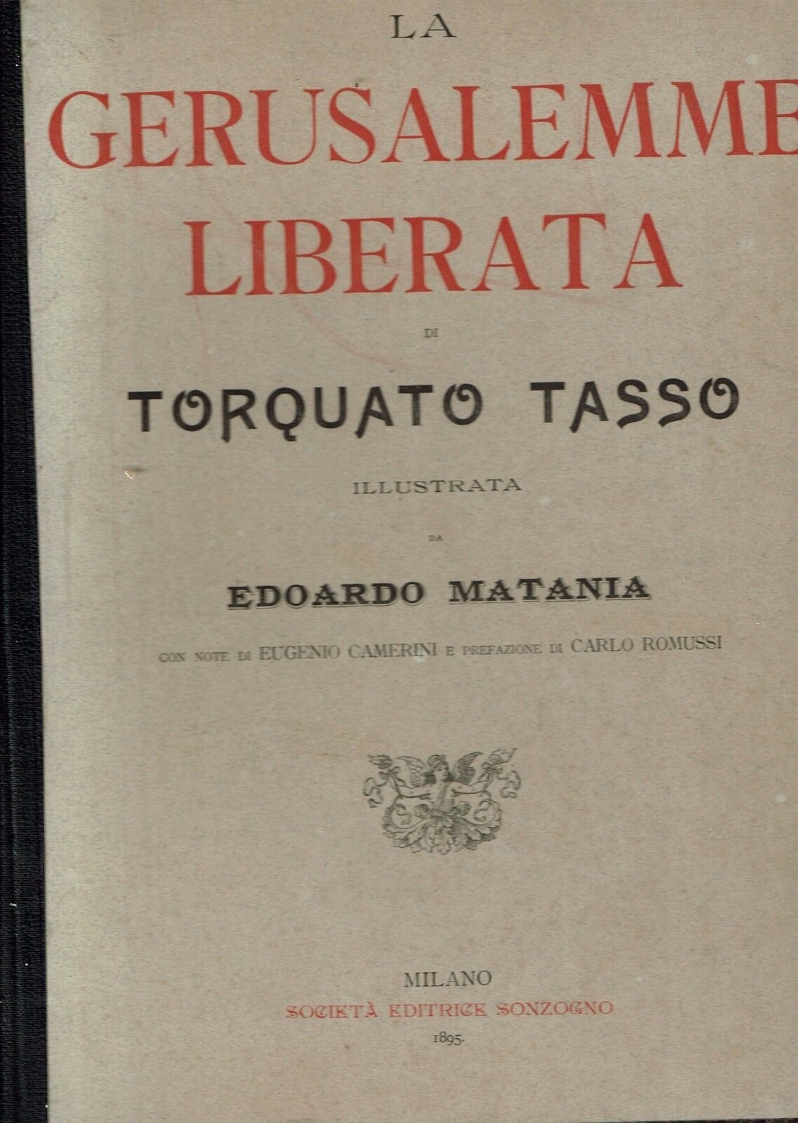 LA GERUSALEMME LIBERATA DI TORQUATO TASSO ILLUSTRATA DA EDOARDO MATANIA CON NOTE DI EUGENIO CAMERINI E PREFAZIONE DI CARLO ROMUSSI ** TASSO TORQUATO ** SONZOGNO 1895. CM. 33,5 X 24.5. RILEGATO IN MEZZA PELLE. PAG. X, 317 + INDICE. CON RITRATTO DEL TASSO IN ANTIPORTA. 20 BELLISSIME TAVOLE A PIENA PAGINA E NUMEROSE VIGNETTE NEL TESTO. ESEMPLARE PERFETTO FIRMA D’APPARTENENZA AL FRONTESPIZIO E MARCHIO IN CERALACCA ALLA PRIMA PP. RIF. LIBR. LETTERATURA LA FOTO CORRISPONDE ALLA REALTA' “