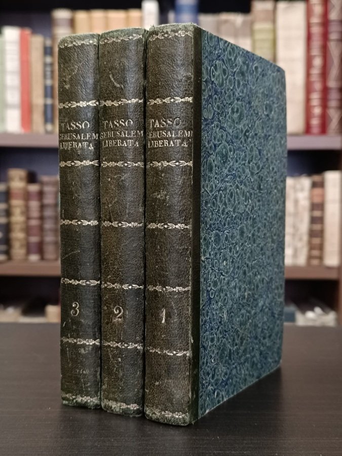 3 volumi (di 4) in-8° (cm. 17,8), solide legature coeve in mezza pelle verde oliva, dorsi lisci con titolo e fregi floreali in oro (lievi tracce d'uso), piatti marmorizzati, tagli spruzzati in blu; pp. [22] 327 [1], 386, 365 [1b] in ottimo stato. Prima edizione della traduzione in versi dialettali milanesi a cura del Balestrieri, qui disponibile nei primi tre volumi; dedicata a sua eccellenza Carlo, conte e signore di Firmian. «La più celebre fra le molte traduzioni dialettali che furono eseguite sull'immortale poema tassiano, come quella di Carlo Fasan in napoletano, Tommaso Mondin in veneziano, Carlo Assonica in bergamasco (la più lodata dal Balestrieri)» [Cat. Hoepli, 35]. Cfr. Predari 372; Meneghina 1551; Serassi 563. Ottimo esemplare. (SG5)