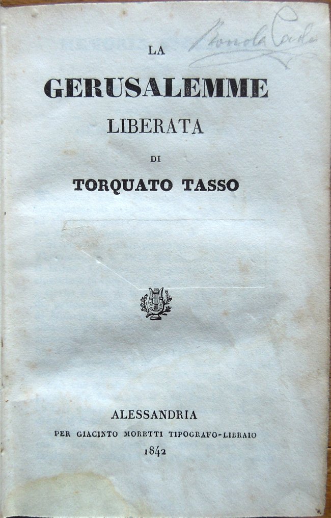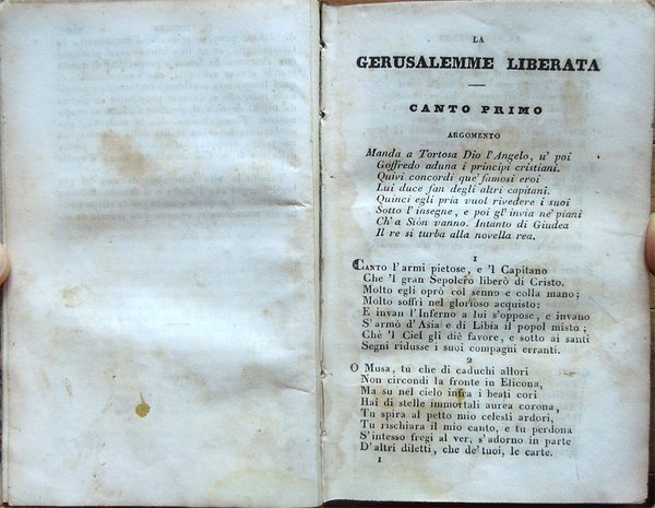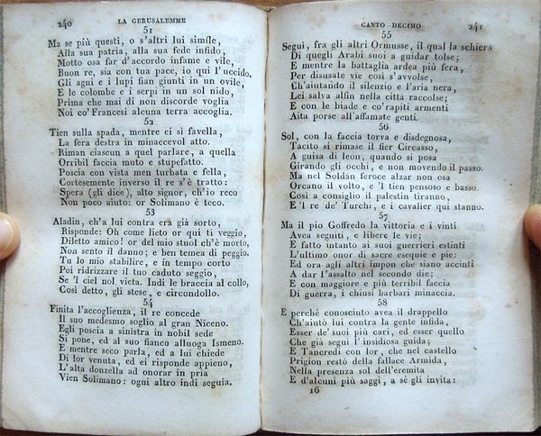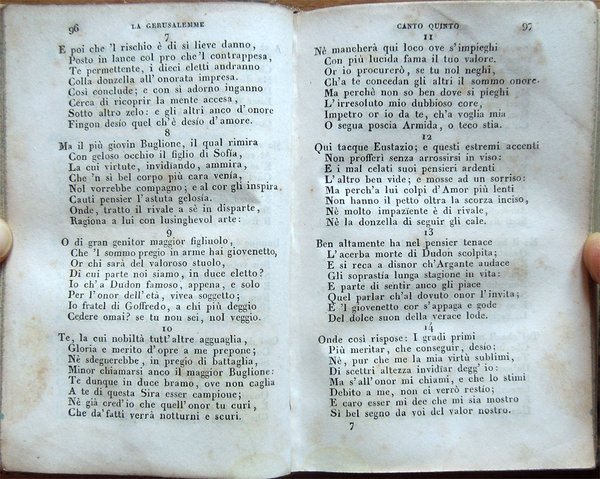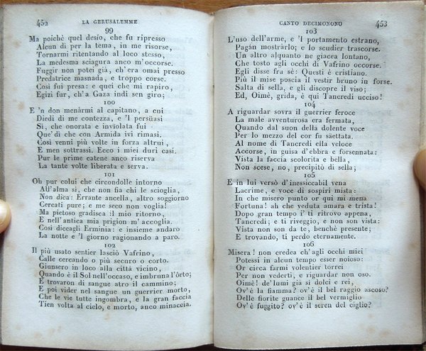 In-24° (12,5 x 8 cm), pp. XIX, (1), 499, (1), legatura coeva in mezza pelle con titoli e fregi in oro al dorso. Qualche segno d'uso e del tempo alla legatura, in particolare, alcune abrasioni alla carta che ricopre i piatti e alla pelle del dorso all'altezza delle cerniere. Tagli decorati a spruzzo. Firme d'appartenenza alle carte di guardia, al frontespizio e al contropiatto posteriore. Etichetta coeva in carta nella parte superiore del contropiatto anteriore. Qualche piccolo segno d'umido, per il resto buon esemplare. Le pagine III-XIX ospitano le «Memorie storiche sopra Torquato Tasso scritte dal Cav. Giuseppe Compagnoni».