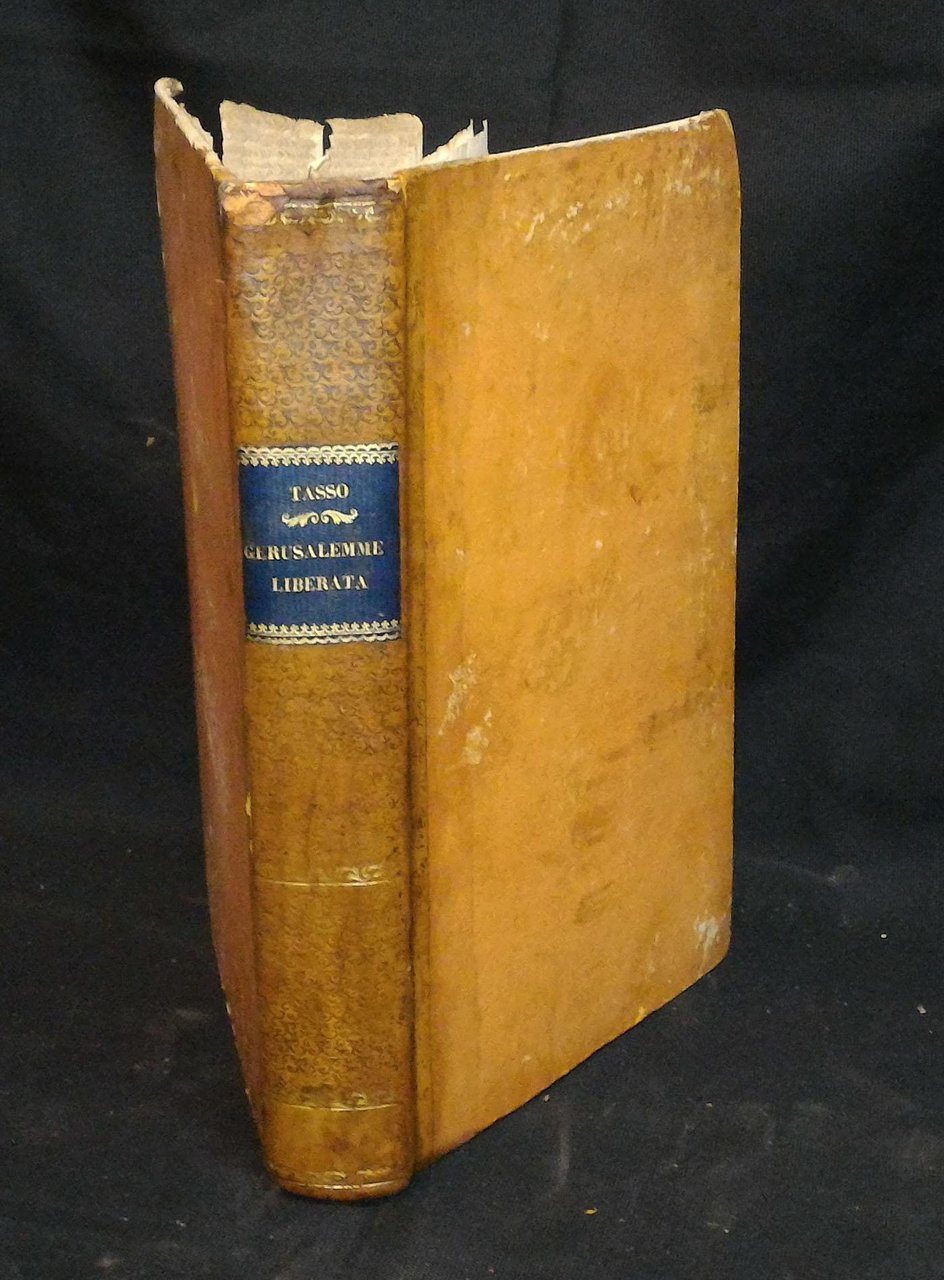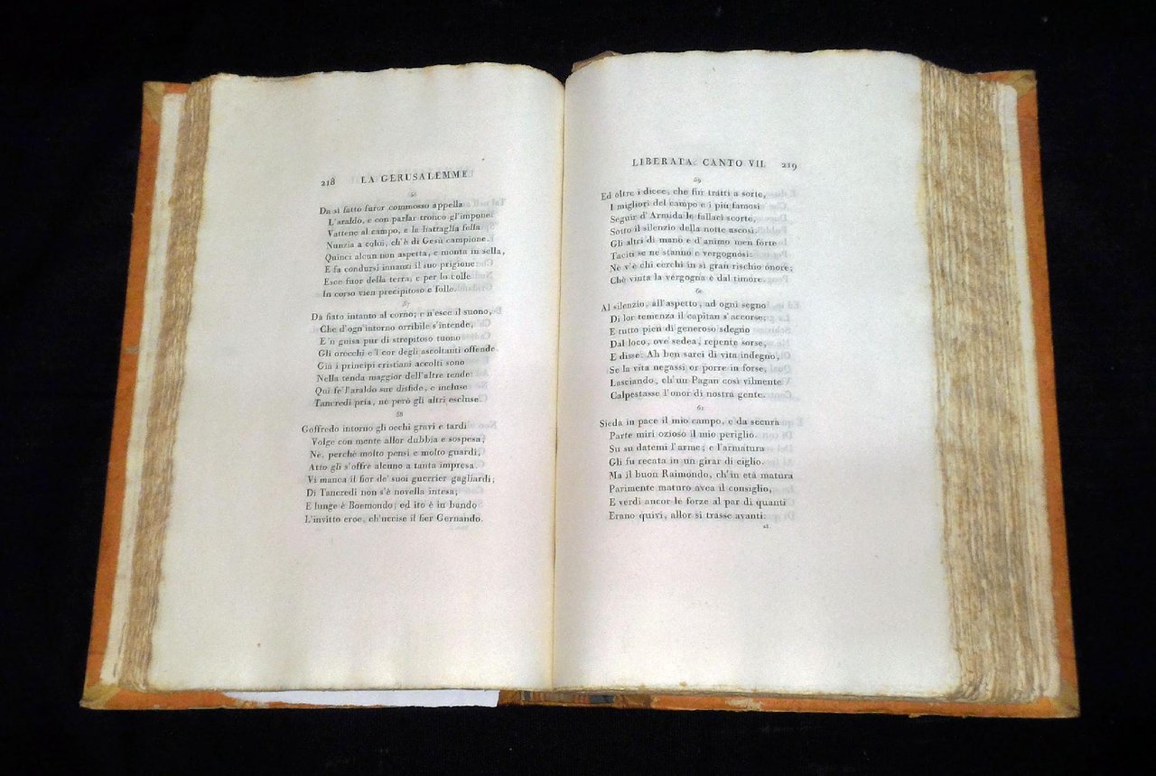 >2 tomi in un vol. in-folio picc. di Londra, pp. (20 il primo b.), 331, (1b.); (2, il primo bianco), 337. Bella leg. coeva m. pelle, tit. oro su tassello e fregi al dorso. Bella ed importante edizione del capolavoro tassiano, dedicata a Carlo IV di Borbone, Re di Spagna, la cui dedica è impressa in grande corsivo; il testo in car. tondo. Il testo fu curato dall'abate Serassi, il quale portò a termine l'impresa «di ridurre la Gerusalemme del Tasso alla più vera e genuina lezione sugli autografi dell'epico immortale» poco prima della sua morte, come scrive lo stesso Bodoni in una lettera del 21 ottobre 1791 al Conte Cesare Ventura. Bell'esemplare a pieni margini, con qualche minimo difetto alla legatura. Brooks 564: ''Altra ediz. in-fol. picc. di Londra, 2 voll.''. Giani n.62.