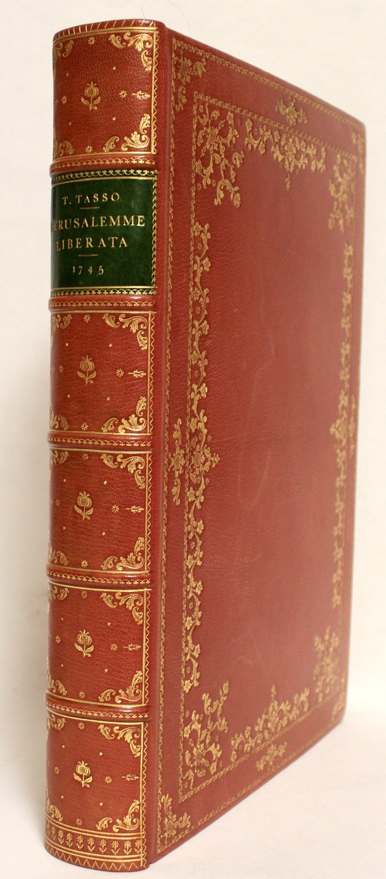 In Folio grande (mm 426x297); l'opera è così composta: occhiello, splendida antiporta incisa in rame, frontespizio in rosso e nero con bella vignetta allegorica in rame raffigurante Venezia, ritratto di Maria Teresa anziana, dedicataria dell'opera, eseguito da Felice Pollanzani, 10 carte non num. (con la dedica, il privilegio di stampa, il catalogo degli associate), carte 252 malnumerate 253 (saltata la pagina 14 nella numerazione), carta finale del testo, la teorica 254, da alcuni citata, non numerata; 1 carta non num. alla fine con raffinata vignetta, 20 finissime incisioni in rame fuori testo da disegni di Piazzetta (incise probabilmente da Baratti secondo i più recenti studi in "Tiepolo - Piazzetta - Novelli. L'incanto del libro illustrato nel Settecento Veneto" scheda III.6) raffiguranti i momenti salienti dei singoli canti, poste ognuna all'inizio del rispettivo canto, contornate da elegante cornice barocca (diversa da quella della prima edizione) formata da fregi decorative, cornucopie e putti con motivi floreali e fontane; 20 incisioni all'inizio dei canti a racchiudere l'argomento dello stesso, a carattere campestre, bellico, mitologico; 20 cul-de-lampe (fra cui 6 a piena pagina e 4, quelle dei canti ottavo, decimo, undecimo, decimoquarto, su carta non num. f.t.), 21 capilettera animati in rame. <BR>Raffinata legatura d'amatore moderna in stile settecentesco, in tutto marocchino rosso amaranto con ricca bordura dorata a ramages ai piatti, cantonali floreali; dorso a sei scomparti con titolo su tassello verde in oro e fregi a piccoli ferri e a rotelle; sguardie marmorizzate. Ottimo esemplare, leggermente rifilato ai margini, timbrino di collezzione al frontespizio. La cosiddetta "Gerusalemme del Piazzetta" è considerata la massima espressione del libro figurato veneziano del Settecento, illustrata dalle splendide incisioni su disegni di Giambattista Piazzetta, che seguì anche la parte incisoria personalmente; l'autore è raffigurato nell'ultima vignetta insieme ad Albrizzi a coronamento della pubblicazione. <BR>Splendido esemplare marginoso, ben conservato della seconda edizione (ben più rara della prima) della celeberrima Gerusalemme Liberata del Piazzetta, che ha sempre costituito per gli studiosi fonte di grande interesse per le successive rielaborazioni avute e il complicato percorso tipografico: tradizionalmente i vecchi studi hanno sempre considerato due tirature della prima edizione a seconda del ritratto di Maria Teresa e del testo posto sotto ai rami (la variante A contempla il ritratto "da vecchia" e le dediche ai sottoscrittori, mentre la B ha il ritratto "da giovane" e componimenti tratti dal testo invece delle dediche al piede delle tavole).<BR>Recenti studi evidenziano un percorso molto complesso anche per numerose differenze tipografiche fra le due tirature. George Knox (vedi "Tiepolo - Piazzetta - Novelli. L'incanto del libro illustrato nel Settecento Veneto" pagina 37), uno degli studiosi più qualificati del Piazzetta, ipotizza che entrambe le versioni fossero in preparazione simultaneamente nel 1740 circa, curate dallo stesso Piazzetta; Albrizzi realizzò la seconda edizione pochissimo tempo dopo la prima del 1745, non appena fu evidente che la prima edizione dell'opera di Tasso sarebbe andata esaurita in poco tempo e che il mercato si sarebbe rivelato di gran lunga superiore al numero di copie ancora disponibili: "Andrew Robison has pointed out that no less than 333 were sold on subscription, and given that all the plates are etchings finished with the graver the limit of the usefulness of the copper plates must have been reached"<BR>Martin Schedl, autore di quasi tutte le incisioni della cosiddetta prima edizione, mori nel 1748 per cui è probabile che l'editore abbia affidato a più artisti il compito di intagliare le tavole per la seconda, fra cui probabilmente Antonio Baratti<BR>Francesco Petronelli in "Tiepolo - Piazzetta - Novelli. L'incanto del libro illustrato nel Settecento Veneto" pagina 37: Personalmente ritengo che le figure e i paesaggi che illustrano la seconda edizione pur risentendo di una certa disomogeneità legata all'intervento di più incisori, siano intagliati con un tratto molto più luminoso e corsivo, tipico dell'incisione veneta dell'epoca, e come tale sicuramente più affine al nostro gusto. Nella mia esperienza devo anche aggiungere che la seconda edizione è molto più rara della prima" <BR>Morazzoni 256: "Non a torto è considerato il più bel libro veneziano…G.B. Piazzetta ha assecondato i desideri dell'editore da pari suo, superando in brio e felicità d'invenzioni la già bella edizione del Bousset, disegnando 70 composizioni e sfoggiandovi una piacevolezza che ci fa passare da meraviglia in meraviglia…è un'edizione che ben caratterizza un'epoca, e ben si merita tutta l'ammirazione che oggi ancora la circonda".<BR>Sander 1887; Gamba 948; Cohen-de Ricci 978; Morazzoni, 256" non a torto è considerate il più bel libro veneziano"; Brunet V, 666; Choix 18734. <BR>