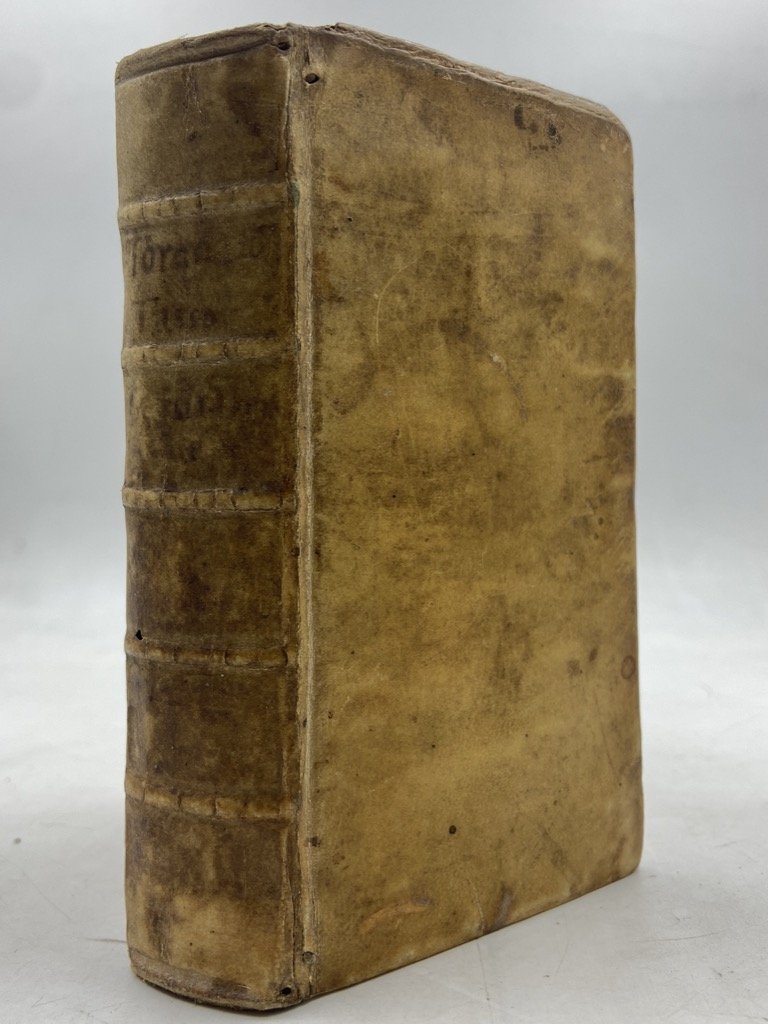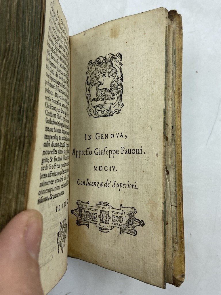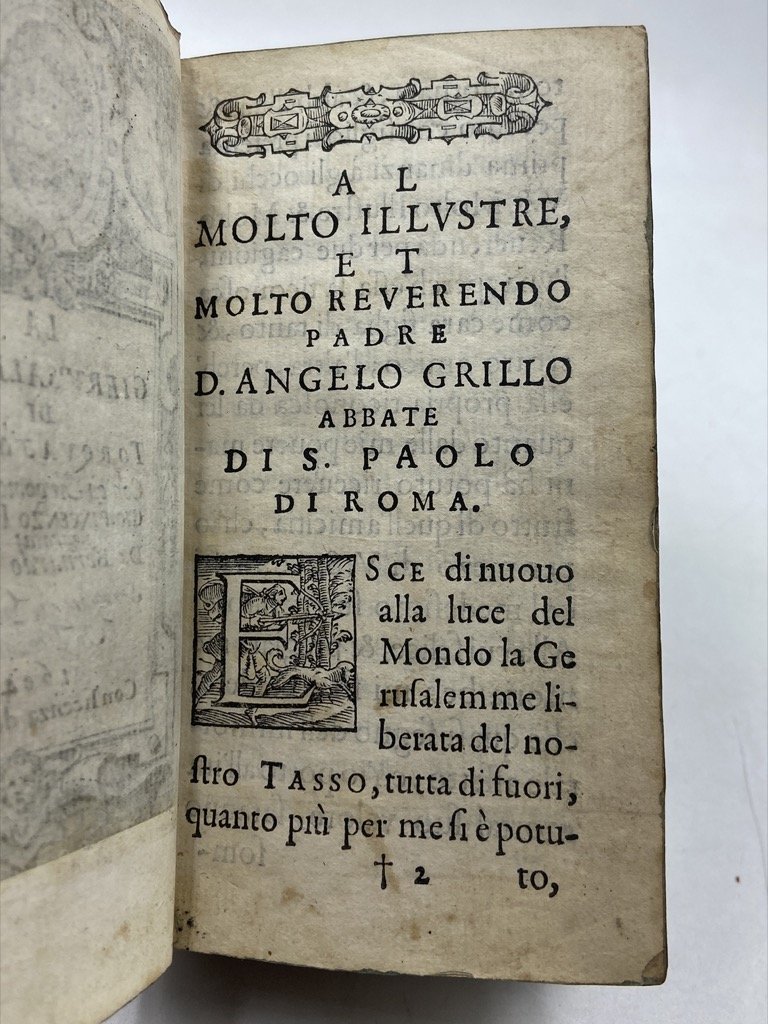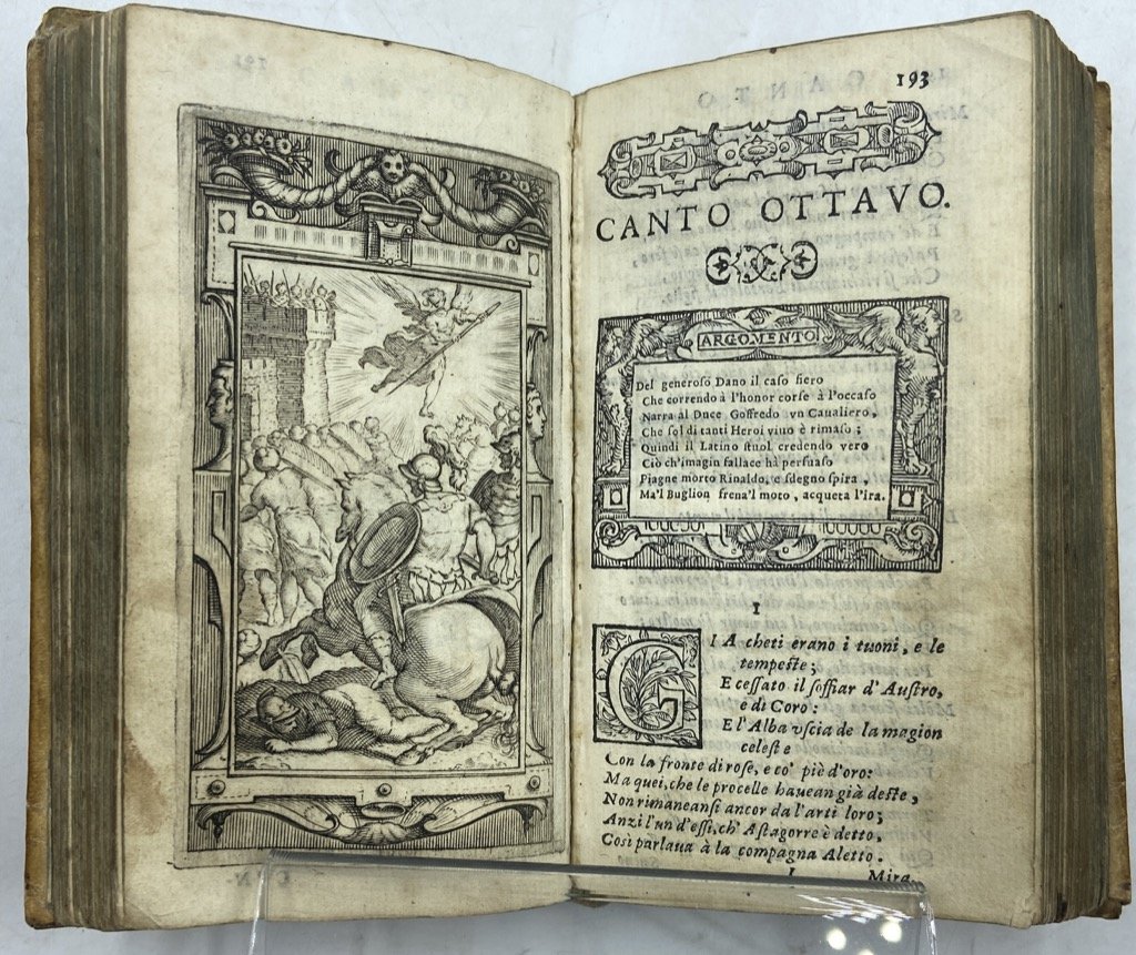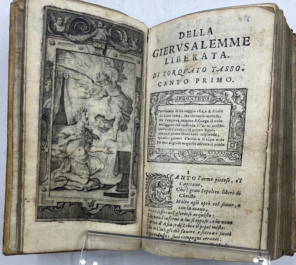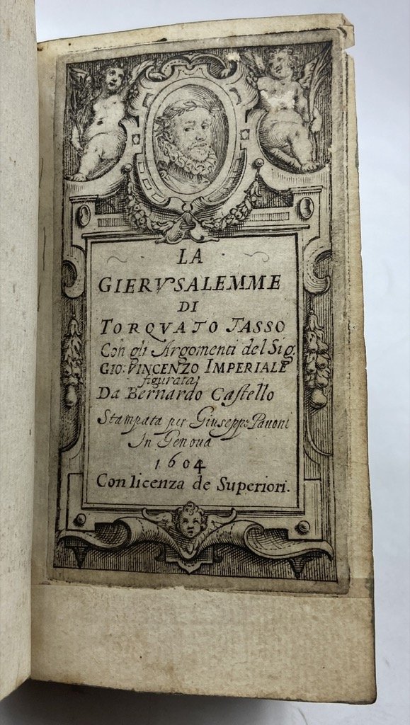 Legatura coeva in pergamena con titoli manoscritti sul dorso a 5 nervi, in dodicesimo cm 14 x 8, pp (24) 572 (4), fregi xilografici (testatine, finalini, capolettera e cornici degli argomenti), frontespizio e 20 figure a piena pagina incisi su rame. Penultima carta con colophon e marca editoriale, ultima carta bianca. Buon esemplare, qualche antica menda, firme di proprietà, lievi segni del tempo. Un minimo restauro moderno al margine inferiore della carta A1. Antica censura su alcuni versi dell’ottava LXIX del canto decimonono. Graziosa edizione della Gerusalemme Liberata illustrata dal pittore genovese Bernardo Castello (1557-1629), per il quale «quella di ‘istoriare’ la Gerusalemme fu sicuramente l’idea di tutta una vita, cui attese fin dal 1586, anno in cui ricevette l’approvazione dello stesso Torquato" (Bondi, 2014); sue infatti le invenzioni per la celebre edizione in quarto del 1590, parzialmente incise da Agostino Carracci, e per quella in folio del 1617. Il Tasso apprezzò molto le figure disegnate dal Castello, e scrisse un sonetto in lode dell’artista «il che obbligò di tal maniera esso Castelli, che … nel 1604 fece ristampare in Genova, per Giuseppe Pavoni, lo stesso Poema in 12° … ornando l’opera con nuove e non men belle figure» (Quadrio VI, p. 670). L’edizione comprende inoltre i nuovi Argomenti di Vincenzo Imperiale, la dedica di B. Castello all’abate Angelo Grillo, e sonetti in lode del pittore composti dal Tasso, dal dedicatario, da Leonardo Spinola e altri. Guidi, Annali p. 15: «Le figure di quest’edizione sono diverse da quelle date nella stampa del 1590, ma molto ben disegnate e d’un finissimo intaglio»; Gamba, 648: «le edizioni genovesi … particolarmente si raccomandano pel fregio delle figure»; Brunet V, p. 666; Graesse VII, p. 33.
