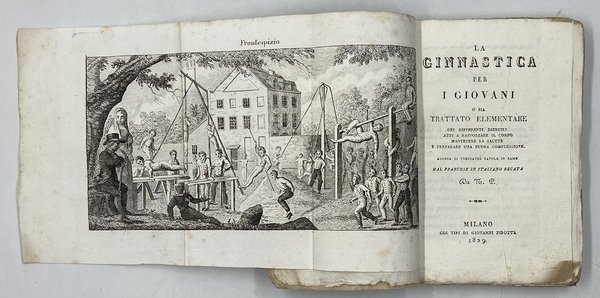 LA GINNASTICA PER I GIOVANI O SIA TRATTATO ELEMENTARE DEI DIFFERENTI ESERCIZI ATTI A RAFFORZARE IL CORPO, MANTENERE LA SALUTE E PREPARARE UNA BUONA COMPLESSIONE. ADORNA DI TRENTATRÈ TAVOLE IN RAME. DAL FRANCESE IN ITALIANO RECATA DA N. P. MILANO COI TIPI DI GIOVANNI PIROTTA 1829.