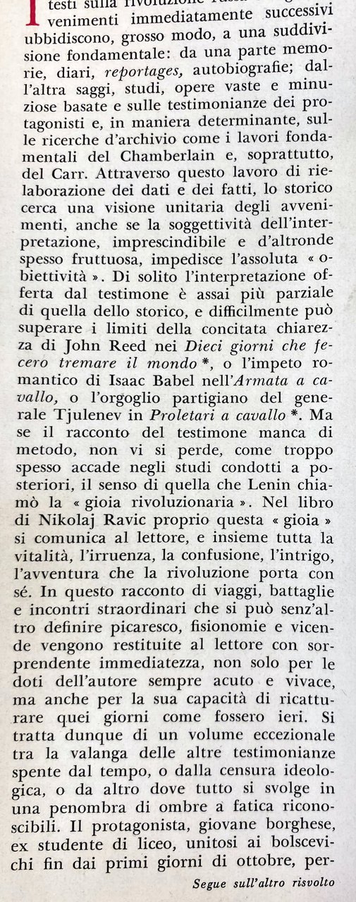I testi sulla rivoluzione russa e sugli avvenimenti immediatamente successivi ubbidiscono, grosso modo, a una suddivisione fondamentale: da una parte memorie, diari, reportages, autobiografie; dall'altra saggi, studi, opere vaste e minuziose basate e sulle testimonianze dei protagonisti e, in maniera determinante, sulle ricerche d'archivio come i lavori fondamentali del Chamberlain e, soprattutto, del Carr. Attraverso questo lavoro di rielaborazione dei dati e dei fatti, lo storico cerca una visione unitaria degli avvenimenti, anche se la soggettività dell'interpretazione, imprescindibile e d'altronde spesso fruttuosa, impedisce l'assoluta obiettività. Di solito l'interpretazione offerta dal testimone è assai più parziale di quella dello storico, e difficilmente può superare i limiti della concitata chiarezza di John Reed nei Dieci giorni che fecero tremare il mondo, o l'impeto romantico di Isaac Babel nell'Armata a cavallo, o l'orgoglio partigiano del generale Tjulenev in Proletari a cavallo. Ma se il racconto del testimone manca di metodo, non vi si perde, come troppo spesso accade negli studi condotti a posteriori, il senso di quella che Lenin chiamò la gioia rivoluzionaria. Nel libro di Nikolaj Ravic proprio questa gioia si comunica al lettore, e insieme tutta la vitalità, l'irruenza, la confusione, l'intrigo, l'avventura che la rivoluzione porta con sé. In questo racconto di viaggi, battaglie e incontri straordinari che si può senz'altro definire picaresco, fisionomie e vicende vengono restituite al lettore con sorprendente immediatezza, non solo per le doti dell'autore sempre acuto e vivace, ma anche per la sua capacità di ricatturare quei giorni come fossero ieri. Si tratta dunque di un volume eccezionale tra la valanga delle altre testimonianze spente dal tempo, o dalla censura ideologica, o da altro dove tutto si svolge in una penombra di ombre a fatica riconoscibili. Il protagonista, giovane borghese, ex studente di liceo, unitosi ai bolscevichi fin dai primi giorni di ottobre, percorre una rapida carriera nell'esercito adempiendo i servizi più disparati in diverse zone di operazione. Lo troviamo a Odessa giunto dal fronte ucraino al seguito dell'enigmatico atamano Grigor'ev, maestro del doppio gioco rivoluzionario, lo troviamo in Bielorussia e poi in Polonia, dove viene fatto prigioniero ma riesce fortunosamente a evadere e a riparare a Mosca. In questa città lavora con Dzerzinskij, il celebre conte polacco fondatore della Ceka, di cui traccia un ritratto indimenticabile. Ma di ogni personaggio incontrato, importante o no, l'autore ci offre una descrizione insolita, proprio perché è interessato al suo carattere o, se vogliamo, alla sua umanità. Alexandra Kollontai in una stanza d'albergo che prende il tè con Dybenko; Raskolnikov nervoso e agitato, nel suo treno, spesso assente a causa delle amnesie provocate da una ferita ricevuta a Kronstadt; Gemal Pascià sbalzato dalla sella del suo meraviglioso purosangue imbizzaritosi per una salva di cannoni esplosa in onore del suo padrone. Non solo i personaggi, ma anche la natura e la bellezza delle regioni, il meccanismo e la furia delle battaglie, gli intrighi diplomatici degli inglesi e dei capi musulmani dell'Asia Centrale, il profumo grasso dei cibi e le brevi, delicate storie d'amore nate nelle città invase, tutti gli aspetti della vita, insomma, immersi nella caldaia della rivoluzione, affiorano nitidi in questo racconto. E qui sta il pregio del libro; l'autore si è proposto un compito difficile ma ha saputo assolverlo pienamente, quello, cioè, di non tacere nulla e ricordare con intensità tutto sulla rivoluzione, glorie e miserie, perché come dice egli stesso con grande semplicità, mi è sembrato importante che nessuno di noi tacesse quel che ricorda e quel che ha vissuto.