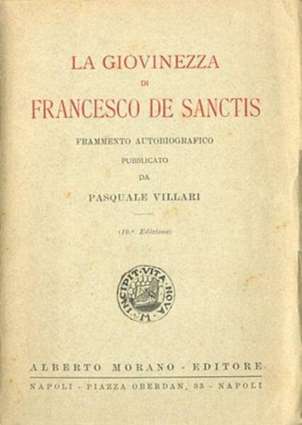 19. ed. XIX, 386 p. ; 20 x 14 cm. Opere di Francesco De Sanctis, 12. Nel 1881, per l'aggravarsi della malattia agli occhi, Francesco De Sanctis, dopo aver lasciato la carica di ministro della Pubblica Istruzione del ministero Cairoli, con l'aiuto della nipote Agnese inizia a scrivere suoi «Ricordi degli anni della giovinezza», destinati a rimanere incompiuti per la sua prematura scomparsa. Pubblicati postumi con il titolo di «La giovinezza», frammento autobiografico, per l'intervento di Pasquale Villari, l'ultima opera del critico irpino è frutto della sua forte «vocazione autobiografica», già sperimentata, con successo, in «Un viaggio elettorale». L'azione di scavo nella memoria consente al De Sanctis di riscoprire la terra natale, la sua Morra, l'ambiente e gli affetti familiari; di ricreare il clima di serenità della sua spensierata fanciullezza. Interessato soprattutto a risalire ai fatti della sua giovinezza, il De Sanctis sposta l'obiettivo della sua operazione di scandaglio mentale alla vecchia Napoli, ma anche alla bellezza naturale e artistica della città, che lo affascina per il suo mondo culturale, le numerose scuole private e lo «Studio» del marchese Puoti, che assurge a luogo di formazione culturale e politica di un'intera generazione di intellettuali. Brossura editoriale, coperta in cartoncino flessibile con titolo impresso al piatto e al dorso. Firma di appertenenza nell'occhietto, per il resto libro integro. Codice libreria 6979.