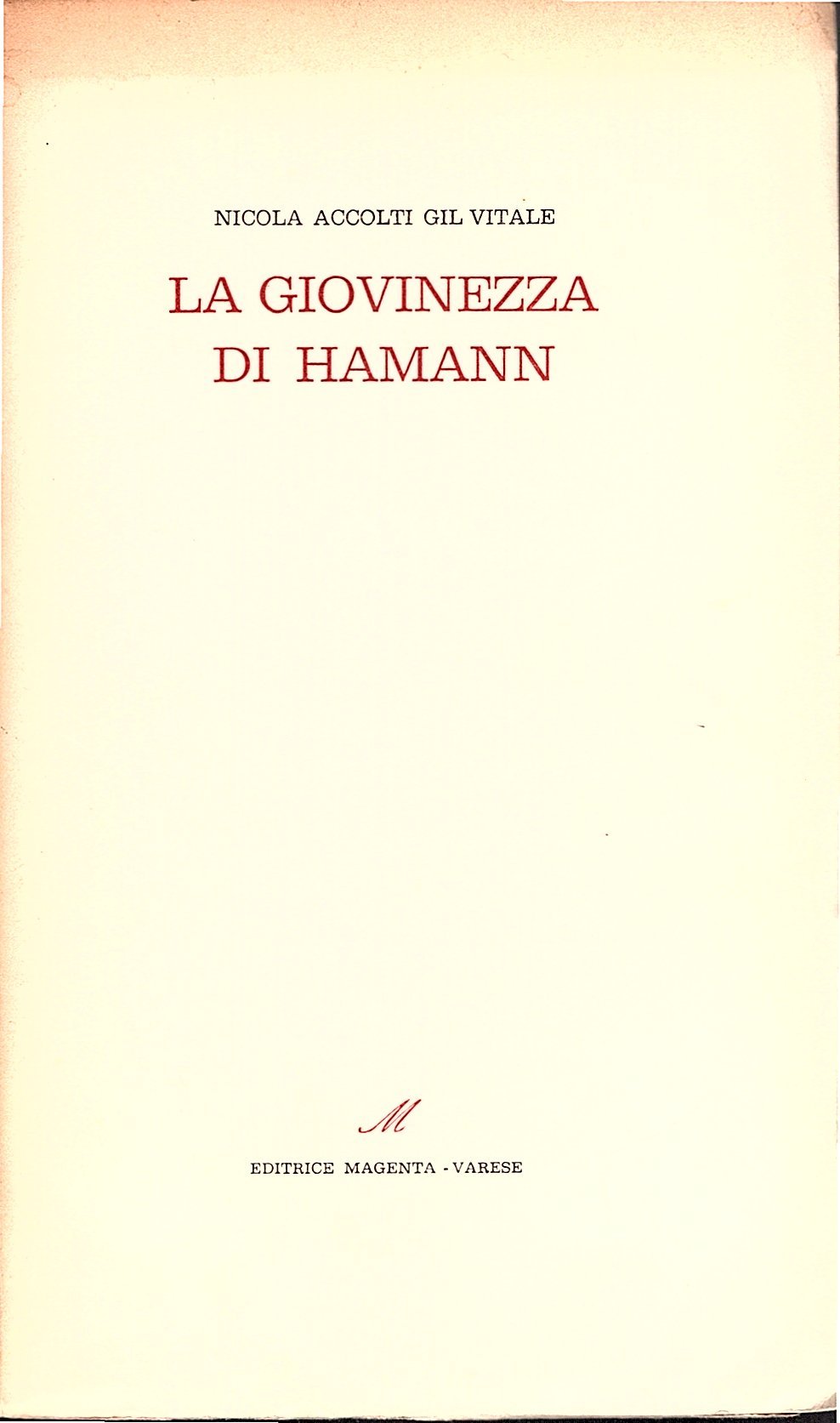 In-8° (21x13 cm), pp. LXIV 169 (3), brossura editoriale avorio con titoli in rosso e nero al dorso e al piatto anteriore. Saggi e ricerche, 3. Ottimo esemplare con dedica autografa dell' autore all' occhiello. Edizione originale di questo studio sulla poliedrica figura di J. G. Hamann il Mago del Nord. Un capitolo è dedicato al neosocratismo hamanniano.