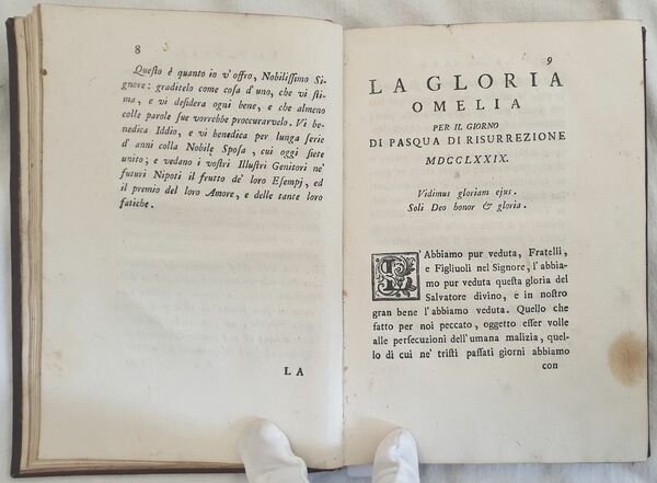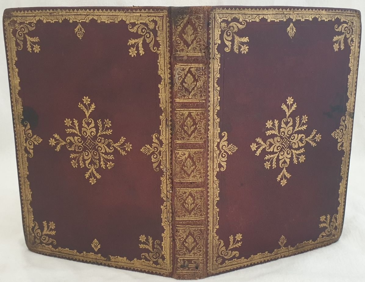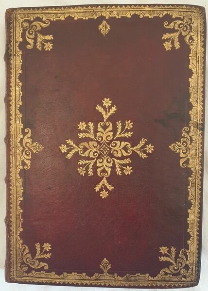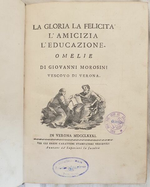 Rara opera, una raccolta di omelie tenute da Giovanni Morosini (1719-1789) Vescovo cattolico prima di Chioggia poi di Verona appartenente all'antica famiglia dei Morosini. Bella vignetta calcografica al frontespizio. Timbro annullato. All'interno omelie sulla gloria, la felicità, l'amicizia, l'educazione. Splendida copertina in pelle rossa con ricche decorazioni in oro. In ottime condizioni. Copertina in piena pelle coeva con ricche decorazioni in oro in ottime condizioni generali con lievi usure ai margini e dorso. Legatura in buone condizioni. All'interno le pagine si presentano in ottime condizioni con rare fioriture. In 8. Dim. 22x16 cm. Pp. (4)+168+(4).Scarce work, a collection of homelies held by Giovanni Morosini (1719-1789) catholic Byshop first of Chioggia then Verona belonging top the antique family of Morosini. Beautiful calcographic vignette in the title page. Erased stamp. Inside homeliees about glory, happiness, friendship, education Wonderful full red leather cover with rich gilted decorations. In very good conditions. Full leather coeval cover with rich gilted decorations in very good general conditions lightly worn in the extremities. Binding in good conditions. Inside pages are in very good conditions with occasional foxing. In 8. Dim. 22x16 cm. Pp. (4)+168+(4).