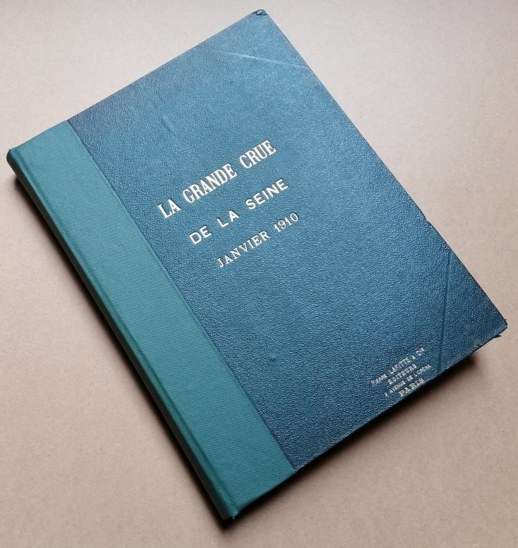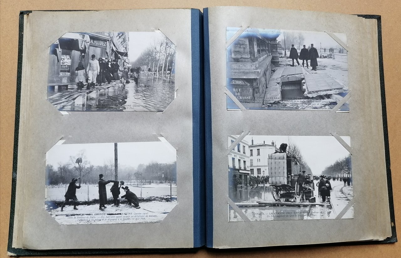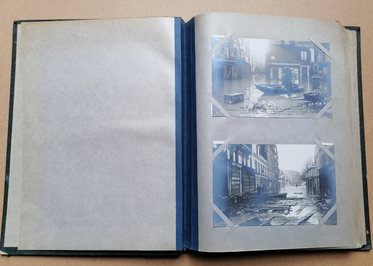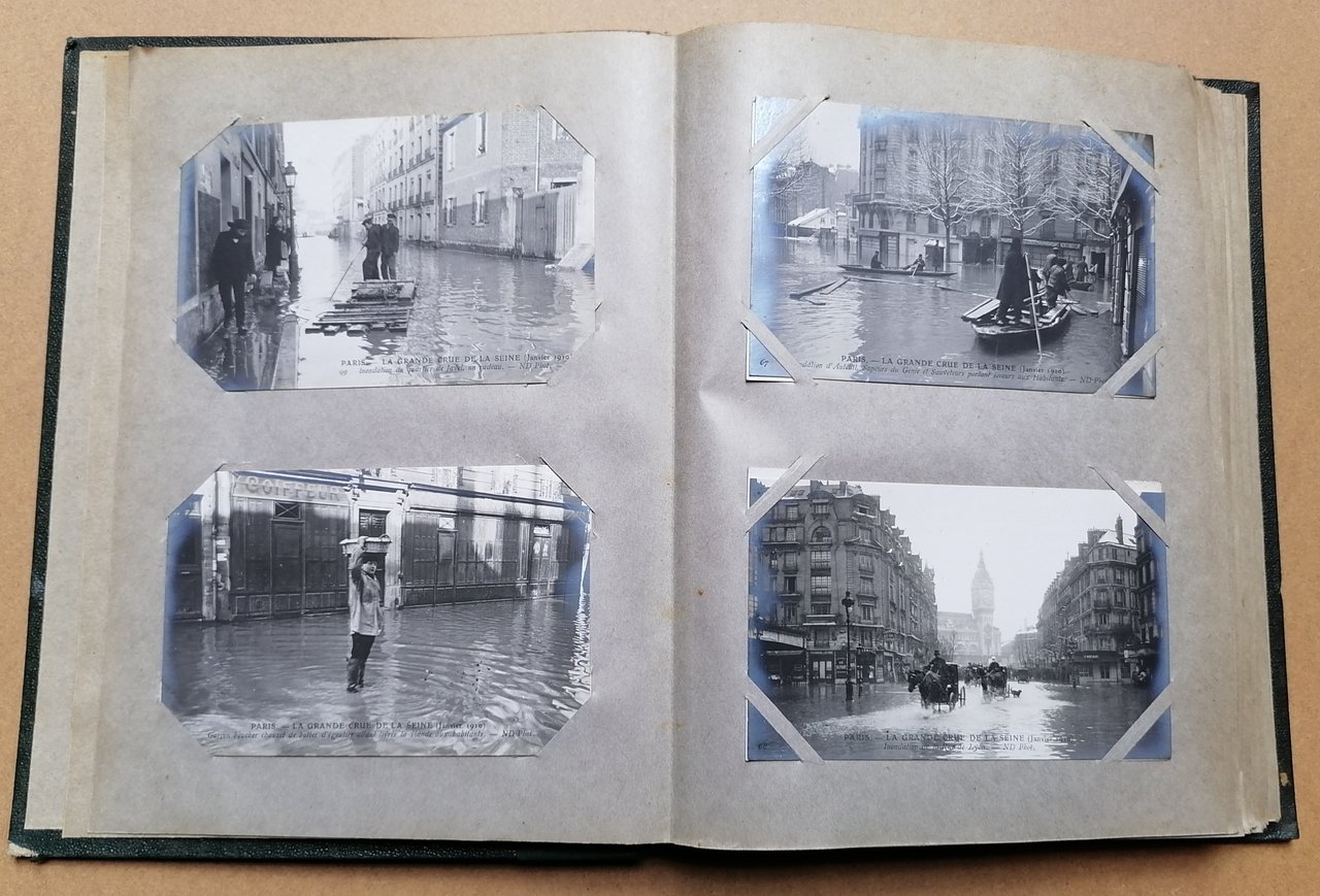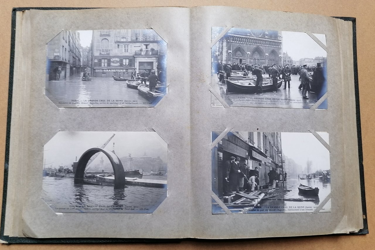 Album in 8° grande (cm 27 x 21,5), legatura coeva in percallina verde con titoli impressi in oro al piatto anteriore, dorso rifatto in tela verde, all'interno 100 cartoline postali di cm 9 x 14, originali e non viaggiate, con immagini fotografiche della citta di Parigi relative alla grande alluvione della Senna del gennaio 1910. Ottimo stato di conservazione.