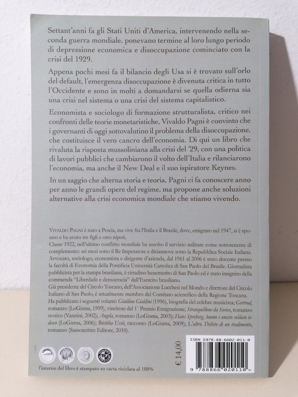 Editore: Sassoscritto Collana: Onice. Saggi EAN: 9788866020110 ISBN: 8866020117 Pagine: 130 Formato: brossura Argomenti: Storia economica Condizioni: Buone condizioni a parte qualche segno d'uso (penna), vedi foto 2C-5-1 Descrizione del libro Settant'anni fa gli Stati Uniti d'America, intervenendo nella seconda guerra mondiale, ponevano termine a un lungo periodo di depressione economica e disoccupazione cominciato con la crisi del 1929. Appena pochi mesi fa il bilancio degli Usa si è trovato sull'orlo del default, l'emergenza disoccupazione è divenuta critica in tutto l'Occidente e sono in molti a domandarsi se quella odierna sia una crisi nel sistema o una crisi del sistema capitalistico. Economista e sociologo di formazione strutturalista, critico nei confronti delle teorie monetaristiche, Vivaldo Pagni è convinto che i governanti di oggi sottovalutino il problema della disoccupazione, che costituisce il vero cancro dell'economia. Di qui un libro che rivaluta la risposta mussoliniana alla crisi del '29, con una politica di lavori pubblici che cambiarono il volto dell'Italia e rilanciarono l'economia, ma anche il New Deal e il suo ispiratore Keynes. In un saggio che alterna storia e teoria, Pagni ci fa conoscere anno per anno le grandi opere del regime, ma propone anche soluzioni alternative alla crisi economica mondiale che stiamo vivendo.