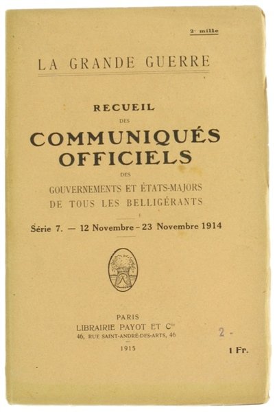 La Grande Guerre - RECUEIL DES COMMUNIQUÉS OFFICIELS des Gouvernements et État-Majors de tous les Belligérants. Série 7 : 12 Novembre - 23 Novembre 1914.