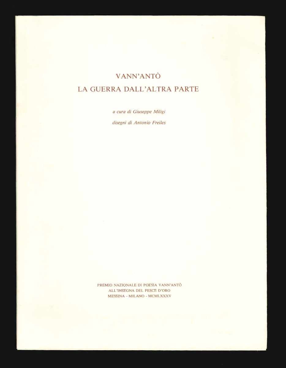 LIBROPrima edizione.Ottimo esemplare (piccole pieghe all’angolo esterno delle carte e dei piatti).Pagine di diario di guerra scritte dal 14 luglio al 6 agosto di un anno non specificato (spiegano nella prefazione Miligi che si tratta del 1915), accompagnate da disegni di Antonio Freiles. Volume stampato in occasione della ventiduesima edizione del «Premio nazionale di poesia Vann’Antò». Raro: presente in sole cinque biblioteche del catalogo SBN (di cui nessuna fuori dalla Sicilia), il libro compare molto di rado sul mercato.