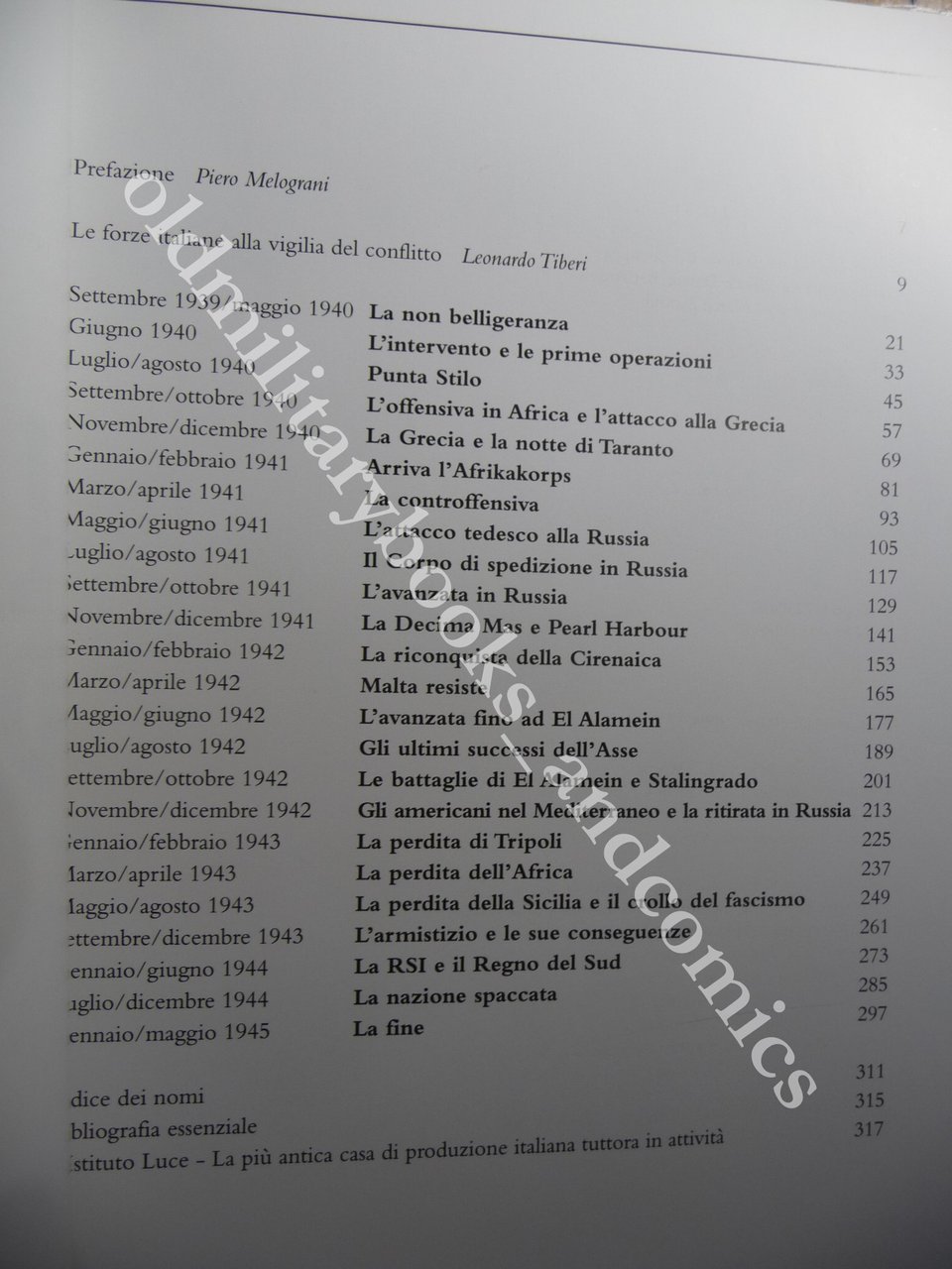 ?In un volume fotografico la cronaca della Seconda guerra mondiale è vista attraverso le immagini catturate al fronte e sul suolo patrio, nelle stanze del potere. Le sequenze fotografiche, tutte tratte dall'Archivio Luce, ripercorrono le fasi del conflitto e le parole dello storico Piero Melograni raccontano gli anni della guerra seguendo una partizione per bimestri.