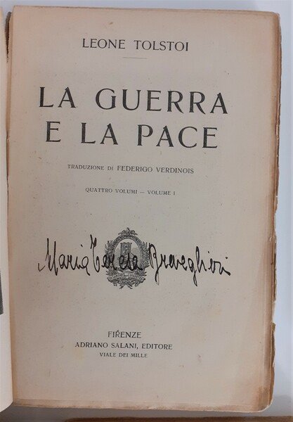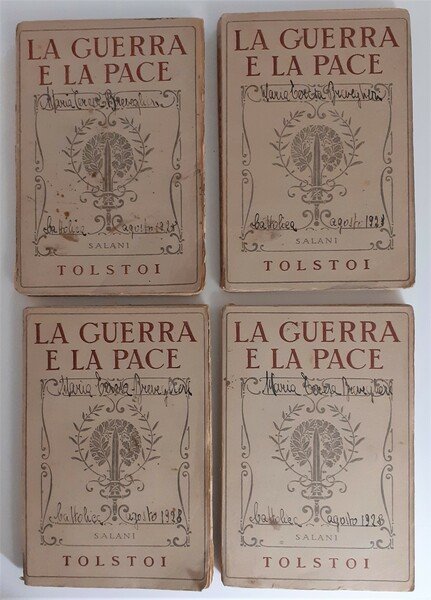 In 8°; 4 tomi: 290, (6) pp., 209, (3) pp., 323, (3) pp., 278, (2) pp. Un ritratto di Tolstoi in antiporta. Brossura editoriale. Una piccola mancanza di carta nel margine basso del dorso di uno dei volumi, uno strappetto al recto della brossura del quarto volume, con piccola perdita di carta, ininfluente e per il resto, nel complesso esemplare in buone-ottime condizioni di conservazione. Una nota di possesso privata ai piatti anteriori datata 1928 Cattolica. Seconda edizione, dopo quella del 1914, della traduzione di Federigo Verdinois, di uno dei capolavori della letteratura russa e mondiale dell'ottocento.