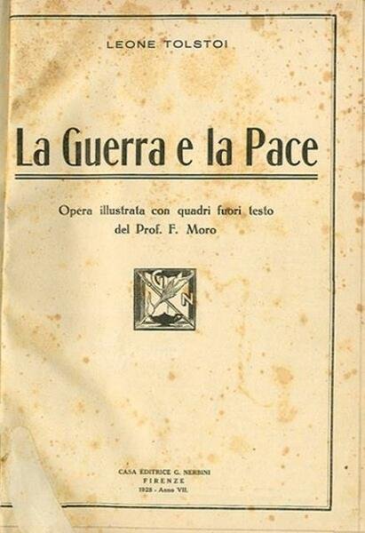274 p., 18 c. di tav. : ill. ; 26 x 19 cm. Meditata a partire dal 1863, più volte rivista e riscritta fino alla versione del 1886, «Guerra e pace» è l'opera più nota di Tolstòj e una delle più lette e amate della letteratura universale. In queste pagine di altissima scrittura, in cui spiccano le celeberrime figure della contessina Natàsha Rostòva e del principe Andréj Bolkònskij, si narrano le vicende di due famiglie dell'aristocrazia russa, i Bolkònskij e i Rostòv appunto, sullo sfondo della Russia patriarcale e contadina devastata dalle guerre e dall'invasione di Napoleone, ma ancor più sconvolta dall'influsso, borghese e civilissimo, dell'Europa occidentale. Della Grande Russia di inizio Ottocento "Guerra e pace" è infatti insieme il magnifico epos e la struggente elegia. Un capolavoro che esce dagli angusti confini del romanzo, per ampliarsi e trasformarsi al di là di ogni definizione di genere, e diventare di volta in volta romanzo storico, cronaca familiare, trattato storiografico, pamphlet, testo filosofico. Titolo originale dell'opera: «Война и мир» [«Vojna i mir»]. Questa edizione popolare è illustrata con quadri fuori testo del prof. F. Moro. Legatura non originale in cartone rigido, dorso in tela verde. Segni del tempo ai profili della coperta, carta interna ingiallita con fioriture, per il resto libro integro. Firma di appartenenza alla pag. 3. Contiene 18 illustrazioni in b/n fuori testo su carta patinata lucida. Codice libreria 6114.