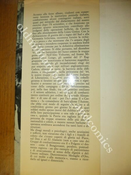 DESCRIZIONE: Mursia Milano 1967 II^ Ed., br. ed. ca. con sovracc. ill. con alette, pp. 317, con 32 illustrazioni in nero f.t. e 6 cartine in 8°. Da Cassino alla Linea Gotica storia dei soldati italiani che combatterono nei vari reparti del Corpo Italiano di Liberazione scritta dal comandante del Gruppo di Combattimento Cremona, una testimonianza diretta. CONDIZIONI: Ottime. PESO / WEIGHT: 600 gr. without package