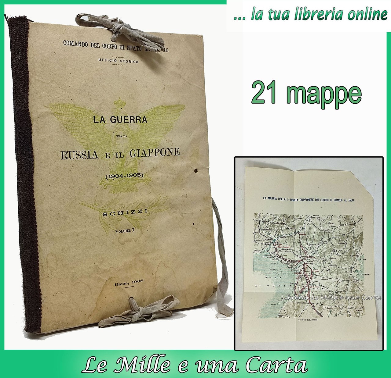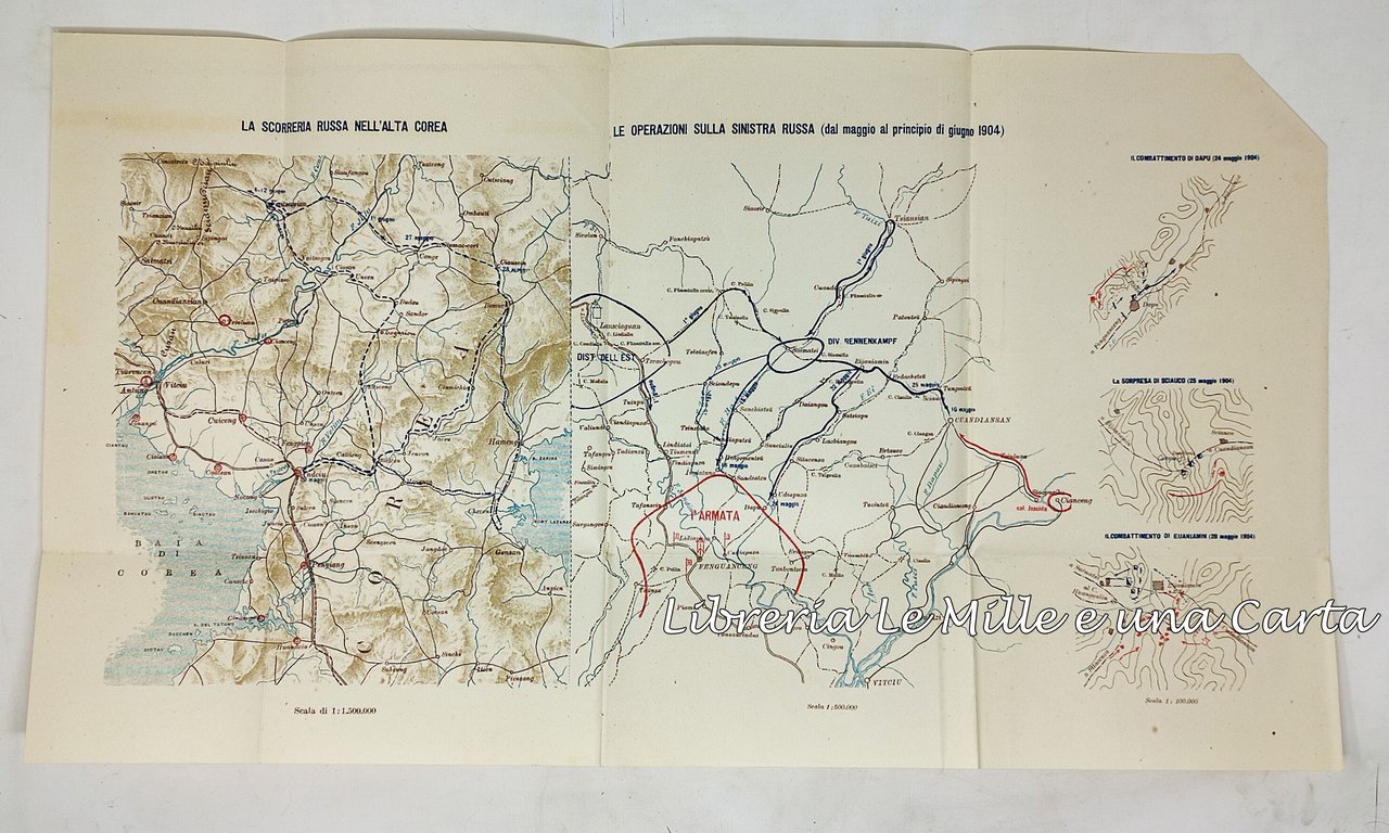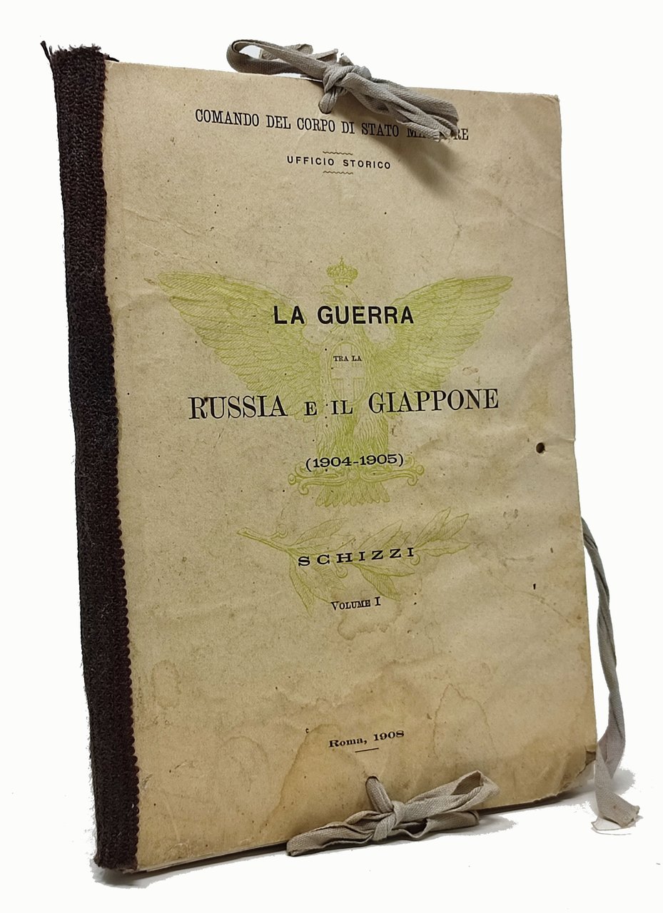 Comando del corpo di Stato Maggiore. Ufficio storico. Roma, 1908. Nella cartella editoriale (con lacci in tela per la sua chiusura), di dimensioni 17,5 x 24,5 cm circa sono custodite tutte e 21 mappe relative al teatro della guerra.; Le mappe, a causa delle loro dimensioni, sono più volte piegate su loro stesse.; Lingua del testo: italiano. Stato di conservazione: qualche alone e piccola mancanza sui margini della cartella che funge da custodia per le 21 mappe. Qualche carta geografica presenta piccoli segni di usura, in corrispondenza delle linee di piegatura. Nel complesso, comunque, un esemplare abbastanza ben conservato. Privo di scritte o segni sulle carte. Cartella completa di tutte le carte, stampate per descrivere le varie fasi ella guerra che, nel 1904, impegnò la Russia contro il Giappone.