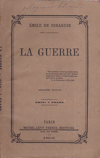In-8°, pp. 56, brossura editoriale marrone con titolo entro bordure plurime con fregi accantonati. Una firma coeva. Un piccolo restauro al piatto. Ottimo stato. Timbri imperiali del tempo del Dipartimento della Senna. Quinta edizione di questa analisi della situazione politica europea del tempo e delle istanze indipendentistiche dell'Italia non ancora unita. 'Ou la Guerre avec ses conquêtes, ou la Paix avec ses progrès !'. Il De Girardin (Parigi, 1806-ivi, 1881) uomo politico, pubblicista e giornalista di orientamento liberale, fondatore de 'La Presse', vi pubblicò in forma pre-originale opere dei maggiori scrittori francesi del tempo, da Balzac a Chateaubriand alla Sand, svolgendo un ruolo cruciale nell'editoria e nella diffusione culturale in terra d'oltralpe. Deputato sin dal 1834, esule dopo il colpo di stato di Napoleone III, poté in seguito tornare a Parigi, riprendendo la pubblicazione de 'La Presse' sino al 1856. Nel 1866 fondò 'La Liberté', apertamente ostile all'Imperatore; negli anni successivi diresse 'Le Petit Journal' e 'La France', confermando la sua eccezionale verve di polemista. Rieletto deputato nel 1877, divenne presidente della commissione parlamentare per la revisione della legge sulla stampa.