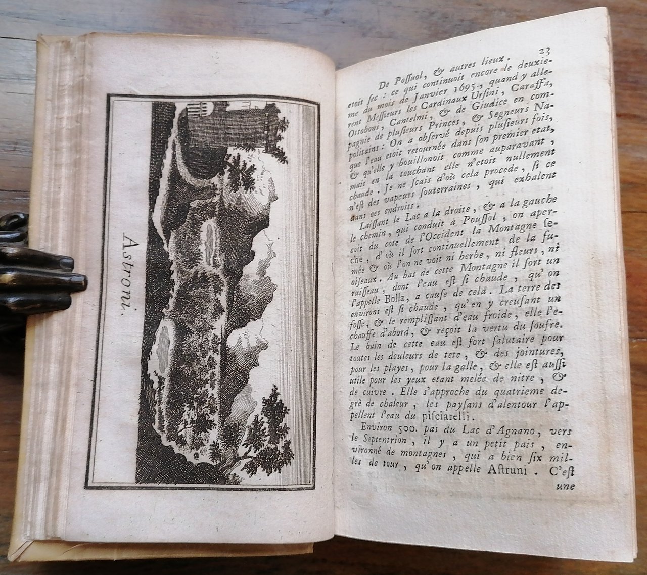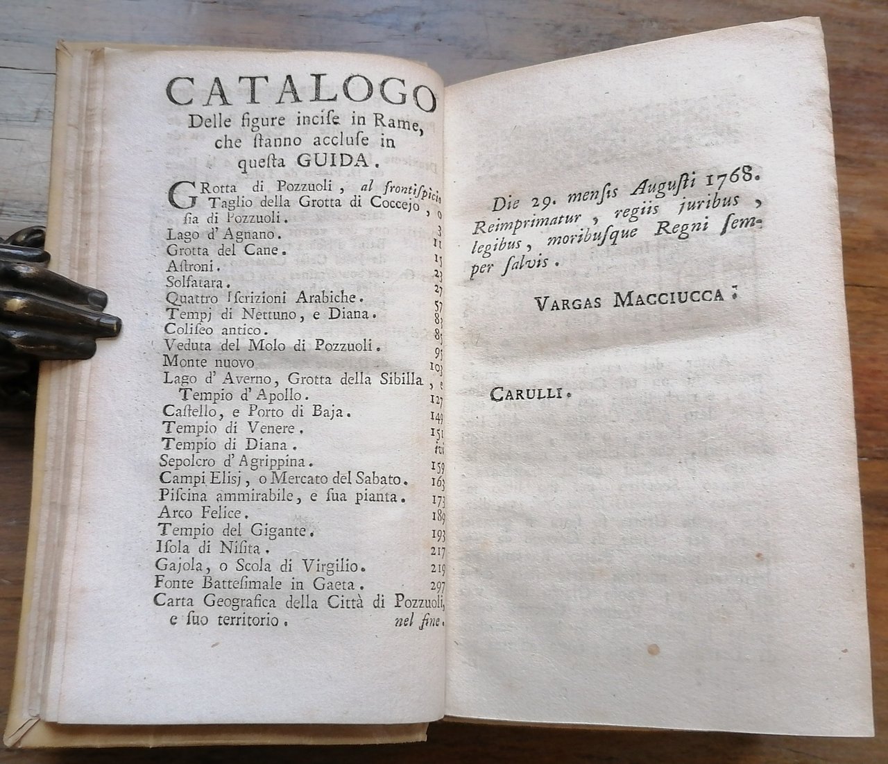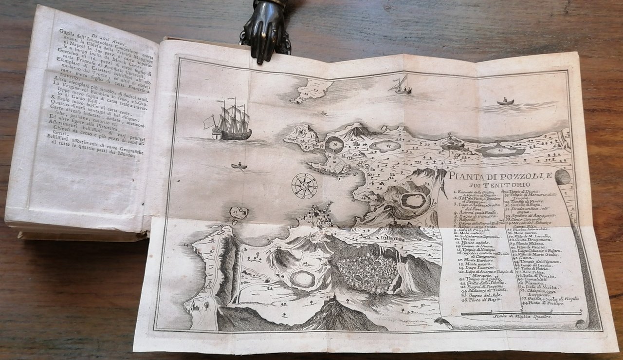 Cm 15 x 9, legatura coeva in piena pergamena con titolo manoscritto al dorso, doppio frontespizio in italiano e francese, pp. (12),312,(12), con 23 tavole fuori testo incise in rame di cui 2 più volte ripiegate, testo in italiano con traduzione in francese a fronte. Le tavole del "Lago d'Agnano" e del "Lago d'Averno" legate in ordine invertito. Ottimo stato di conservazione.