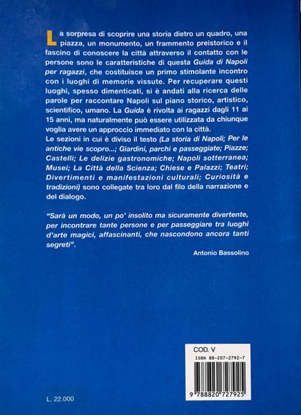 La sorpresa di scoprire una storia dietro un quadro, una piazza, un monumento, un frammento preistorico e il fascino di conoscere la città attraverso il contatto con le persone sono le caratteristiche di questa Guida di Napoli per ragazzi, che costituisce un primo stimolante incontro con i luoghi di memorie vissute. Per recuperare questi luoghi, spesso dimenticati, si è andati alla ricerca delle parole per raccontare Napoli sul piano storico, artistico, scientifico, umano. La Guida è rivolta ai ragazzi dagli 11 ai 15 anni, ma naturalmente può essere utilizzata da chiunque voglia avere un approccio immediato con la città. Le sezioni in cui è diviso il testo (La storia di Napoli; Per le antiche vie scopro.; Giardini, parchi e passeggiate; Piazze; Castelli; Le delizie gastronomiche; Napoli sotterranea; Musei; La Città della Scienza; Chiese e Palazzi; Teatri; Divertimenti e manifestazioni culturali; Curiosità e tradizioni) sono collegate tra loro dal filo della narrazione e del dialogo.