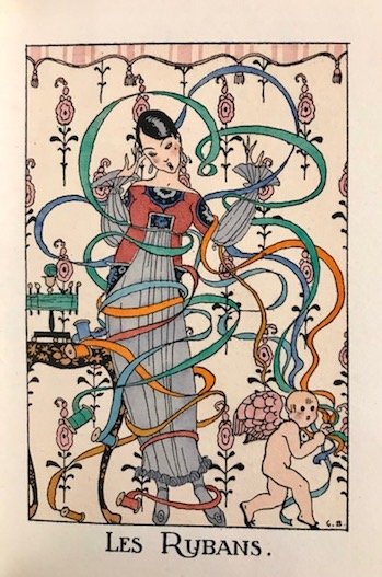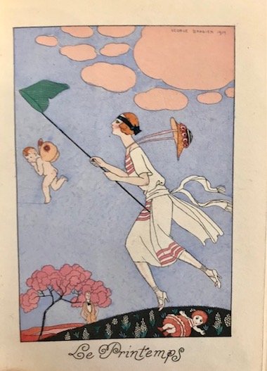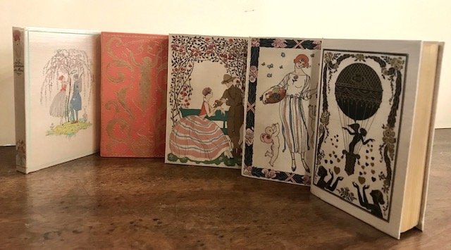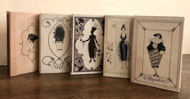 12mo (cm. 12), 5 Voll., 1 c.nn., 88 pp., 27 cc.nn.; 165(1) pp., 4 cc.nn.; 1 c.nn., 122 pp., 2 cc.nn.; 4 cc.nn., 128 pp., 3 cc.nn.; 2 cc.nn., 137(1) pp. Con frontespizi figurati, numerose graziose illustrazioni nel testo e complessive 31 splendide tavole in coloritura ‘pochoir’ fuori testo. Legature editoriali in cartone rivestito di seta. Dorsi e piatti interamente figurati a colori. Tagli dorati. Sovraccoperte e astucci illustrati (tranne quello del primo volume, non illustrato). Raffinate carte di guardia policrome. Salvo una lieve brunitura delle sovraccoperte, esemplare in ottimo stato di conservazione. Opera rarissima a trovarsi completa delle cinque annate pubblicate e in tali condizioni. Una delle opere più eleganti e ricercate del celebre esponente del movimento ‘Art Deco’.