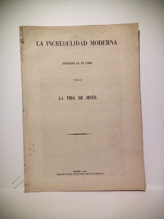 Madrid: Imp. de Tejado, 1864.- 36 p.; 4º mayor (26,5 x 19 cm); Impresión a dos columnas; Cubiertas provisionales.- Interesante estudio de crítica teológica sobre el famoso libro eterodoxo de Renan sobre Jesucristo.* Cuatro hojas presentan un ligero ribete de humedad en su margen superior sin alcanzar al texto. Al carecer de cubiertas originales, estas han sido sustituidas por otras de papel. CRISTOLOGÍA-EVANGELIOS-NAVIDAD