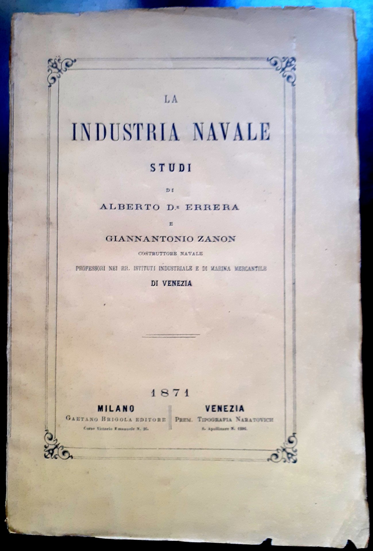 LA INDUSTRIA NAVALE. STUDI di ALBERTO ERRERA e GIANNANTONIO ZANON COSTRUTTORE NAVALE PROFESSORI NEI RR. ISTITUTI INDUSTRIALE E DI MARINA MERCANTILE DI VENEZIA.