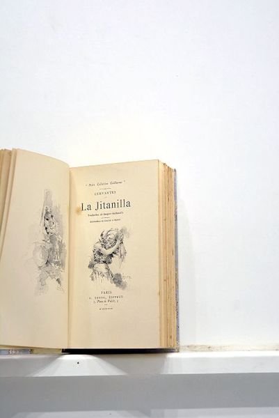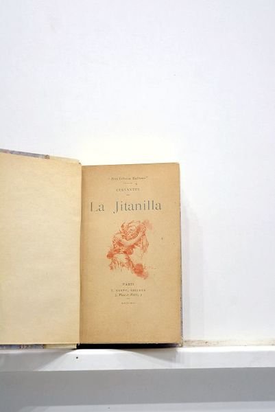 7 feuillets. 144 pages. 4 pages. (8x13,5cm). Demi-basane. Non rogné. Quelques rousseurs à l'intérieur. Excellent état. Charmante édition illustrée de La Jitanilla en français. Cette nouvelle suit la tradition italienne de novellieri créée par Giovanni Boccaccio et développée par Matteo Bandello pendant la Renaissance italienne. Cette nouvelle ouvrait le cycle des douze Nouvelles exemplaires autour de l'amour. C'est la plus longue des nouvelles du recueil.