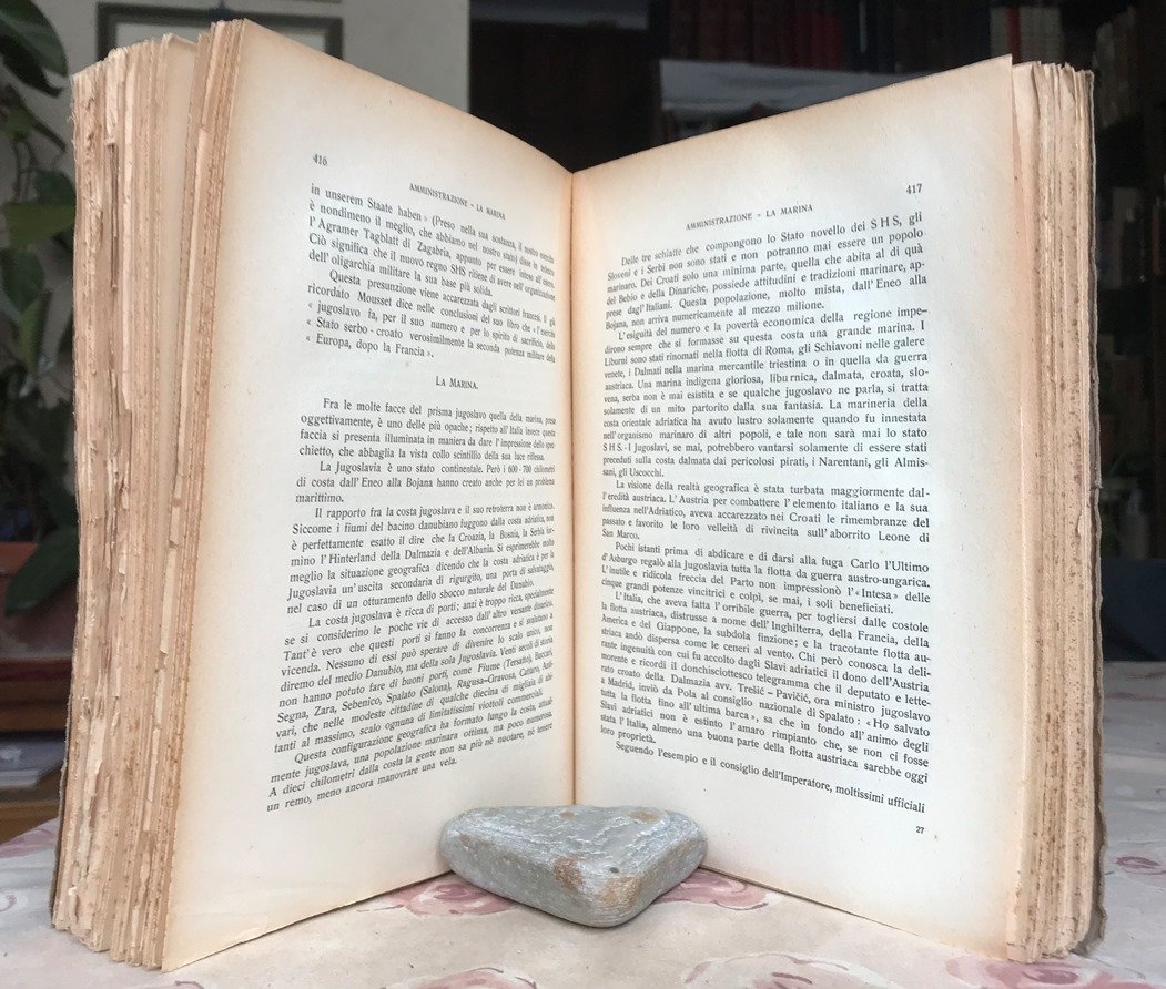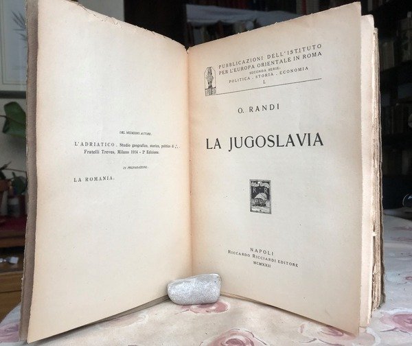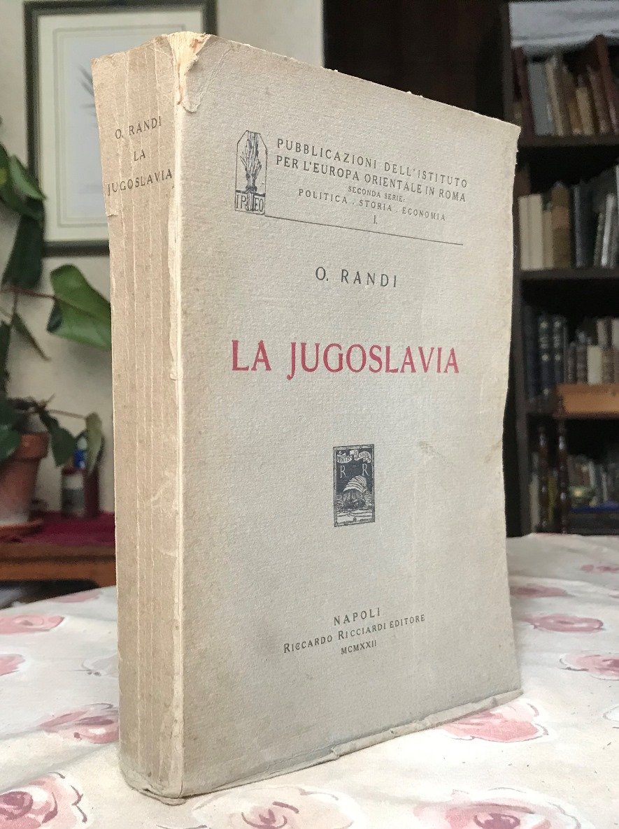 Volume in 8 grande, brossura editoriale, titolo al piatto ed al dorso, bianca iniziale con ampia dedica autografa dell'Autore al noto studioso Alfredo Niceforo, occhiello, frontespizio, VIII, 582 pp., bianca, quattro tavole doppie ft. Importante, esaustivo studio socioeconomico e politico della Jugoslavia in cui l'Autore indaga in ogni piega sociale e geografica per presentare un ritratto il pi veritiero ed efficace della terra al di l dell'Adriatico. Dopo un veloce ma efficace escursus storico dall'antichit al presente, il trattato esplicita la parte economica, studiando le risorse e le ricchezze varie del paese, la parte finanziaria con il sistema monetario e il bilancio nazionale e statale, la parte amministrativa, con una fotografia reale dello stato della scuola, delle leggi, dell'esercito, della stampa e quant'altro, la parte pi dettagliatamente politica e di rapporto fra gli Stati per arrivare ad una sintesi con particolare riguardo alle antitesi fra le due etnie dominanti dei Serbi e dei Croati. Il volume completato da una serie di appendici con documenti atti a chiarire eventuali dissonanze, e da una bibliografia. Ancora in parte intonso, perfetto, ha due piccoli strappi al dorso, senza mancanze e facilmente riparabili. Non comune, importante.