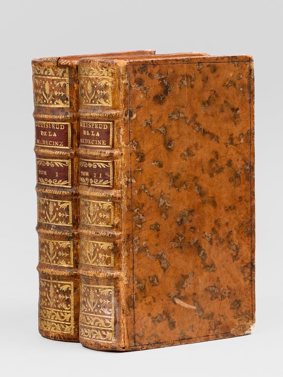 2 vol. in-12 reliure de l'époque pleine basane marbrée, dos à 5 nerfs dorés orné, Chez Malassis le Jeune, Imprimeur du Roi, A Alençon, et Chez Prault Père, Paris, 1763 et 1762, 26 ff., 742 pp. et 1 f. ; 701 pp. et 1 f. Rappel du titre complet : La Jurisprudence de la Médecine en France, ou Traité Historique et Juridique des Etablissemens, Reglemens, Police, Devoirs, Fonctions, Honneurs, Droits & Privilèges des trois Corps de Médecine ; Avec les Devoirs, Fonctions & Autorité des Juges à leur égard (Première Partie commune à toutes les professions de la Médecine : 2 Tomes - Complet) Rare exemplaire bien complet avec ces deux tomes de la "Première Partie", "commune à toutes les professions de la Médecine". Jean Verdier publiera en 1764 "La Jurisprudence particulière de la chirurgie en France". Le présent ouvrage est toujours cité dans les travaux relatifs à l'histoire de la déontologie en France. Bon état (petit accroc en coiffe sup., bon exemplaire par ailleurs).