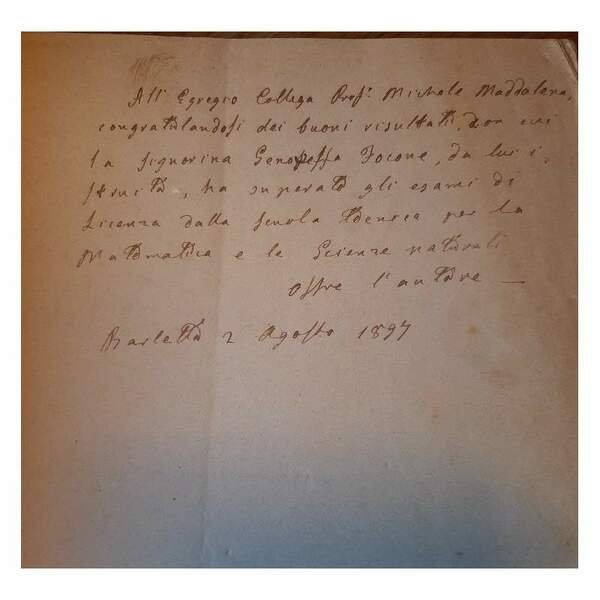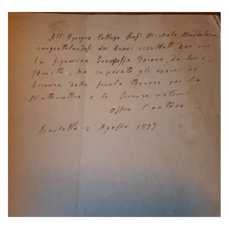In 8', br. ed. pp. 72, a proposito d'una modesta questione didattica sul primo insegnamento degli elementi di matematica; piatto post. staccato, mancanze al dorso, segni d'uso alla cop., interno buono, segni del tempo; ampia dedica alla prima bianca.Luogo di pubblicazione BarlettaEditore Stab. Tip. Dellisanti e GiannoneAnno pubblicazione 1895Materia/Argomento Didattica, Matematica ***Due to bureaucratic reasons, books dated over 70 years old cannot be immediately exported, please contact us before placing the order.***