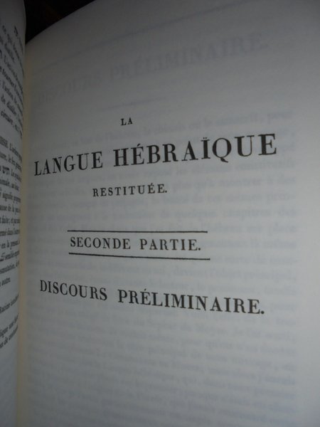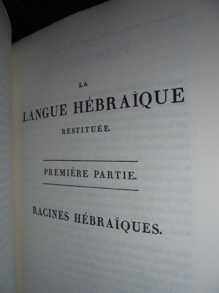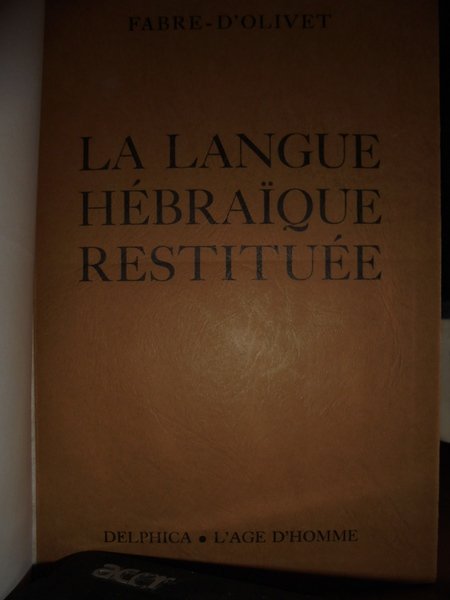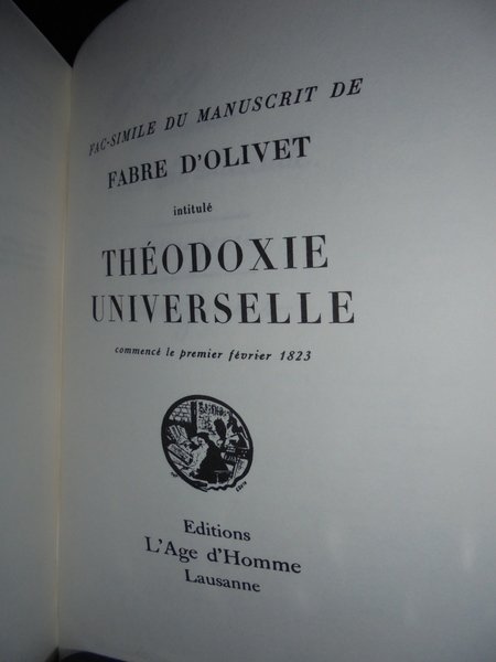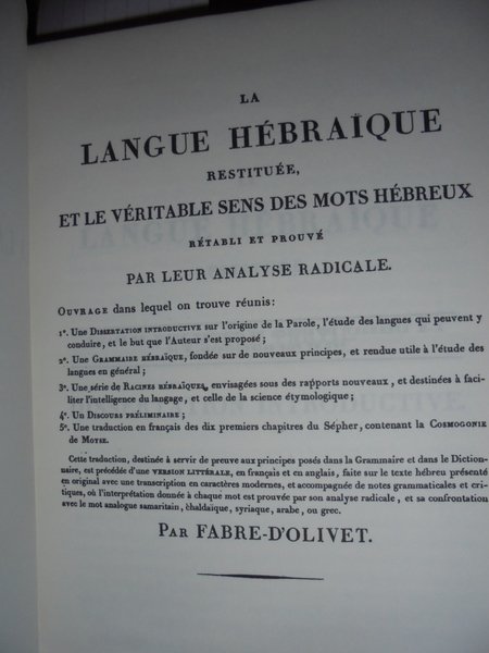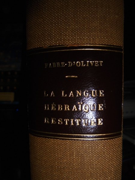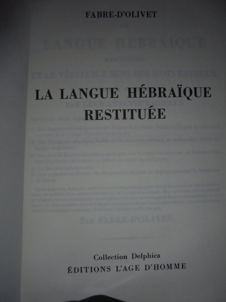 Fabre-D' Olivet. Suisse, Collection Delphica, éditions L' Age D' Homme, 1985. La langue HÉBRAÏQUE restituée. In-8°, tela (legatura nuova), copertine originali conservate. 2 parti in un volume. Prèmiere partie: Dissertation introductive 197 pp. Prèmiere partie: Racines HÉBRAÏQUES 136 pp. Seconde partie: Discours Préliminaire. Seconde partie: Cosmogonie de Moyse, traduction correcte. Complessive 345, (5) della seconda parte. Fac-simile du manuscrit de Fabre D' Olivet intitulé Théodoxie Universelle 42 pp. Questo suo lavoro è considerato un classico per gli adepti della letteratura esoterica. L'autore tenta di dimostrare che i primi dieci capitoli della Bibbia contenenti la cosmologia di Mosè, hanno sofferto terribilmente nelle traduzioni eseguite da autori ellenistici, e propone pertanto un nuovo sistema di analisi entomologica, fornendo utili e altamente dettagliate comparazioni tra la lingua ebraica e le altre lingue antiche, tentando di decifrare le allegorie morali che le sue traduzioni corrette rivelano. Esemplare come nuovo. Neg. esot. mob. 13 basso